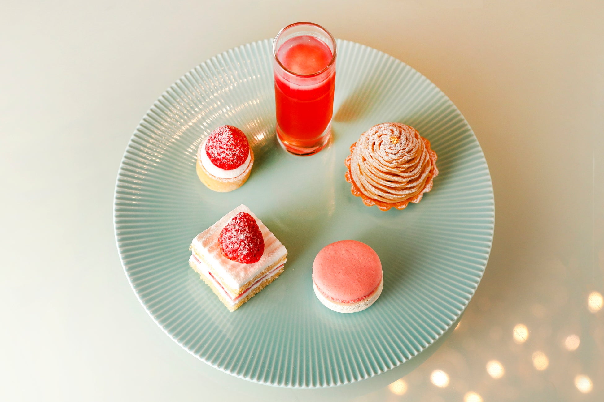 上段は、「あまおう・スポンジ・生クリーム」が三位一体となる極上の口どけを追求した、究極のショートケーキ『新スーパーあまおうショートケーキ』や「博多あまおう」の甘みをギュッと濃縮し、爽やかないちごの香りをお愉しみいただける『あまおうゼリー』、サクサクのタルト生地にみずみずしいあまおうをトッピングした『あまおうタルト』、口に入れるとフルーティーで甘い香りが広がる『あまおうマカロン』の"いちごの王様"博多あまおうを贅沢に使用した5種のスイーツが一皿に。