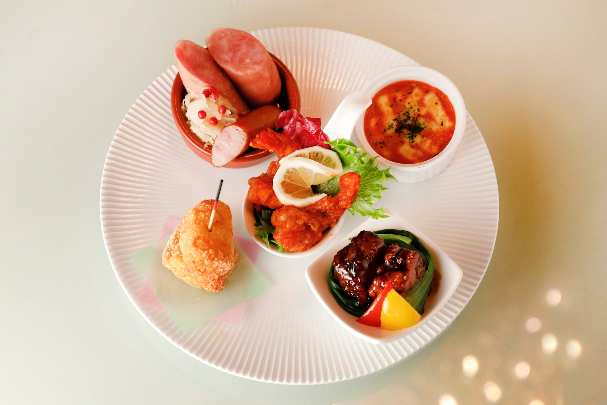 下段には5種のお食事を。シュクルートを添えたグリルソーセージや一口サイズの『カニクリームコロッケ』、ぷりっとしたエビの食感と、香ばしいガーリックが食欲をそそる『ガーリックシュリンプ』や黒酢の芳醇な香りと柔らかな酸味の『黒酢酢豚』など、どれも主役級のメニューを少しずつお愉しみいただけます。