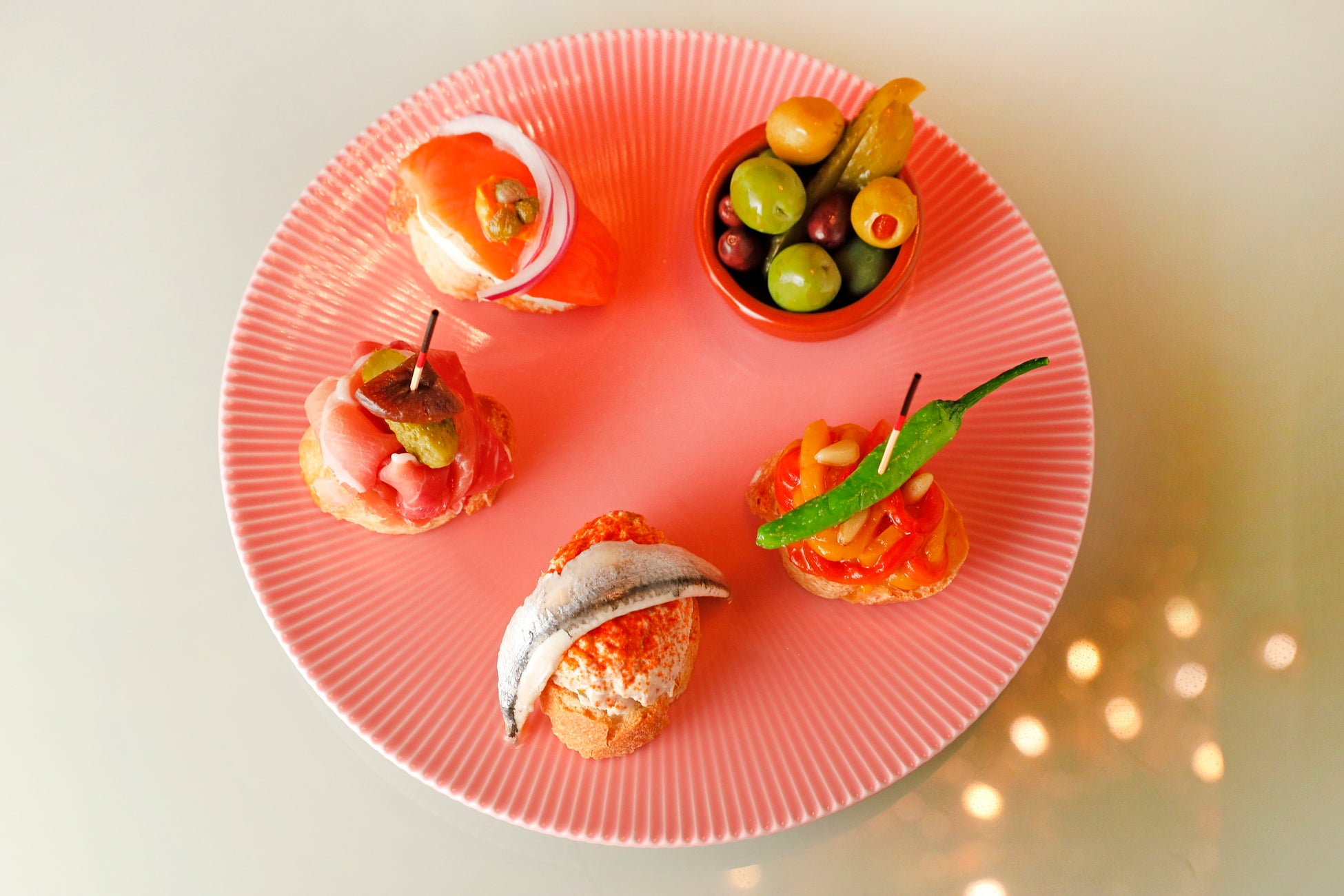中段には、「ガーデンラウンジ」で夜のみ登場する人気のタパス4種をボリューミーなサイズでご用意。スペイン産生ハム、イワシやパプリカのマリネ、スモークサーモンとクリームチーズを、丁寧に焼き上げたバケットに乗せました。シャンパーニュにもぴったりな味付けに。