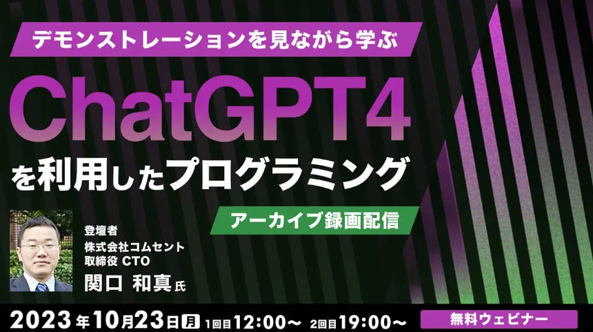 講師を務めるのは、株式会社コムセント(Web制作会社)のCTOとしてWebサイト作成、システム開発およびプログラム開発に従事されている関口 和真 氏です。プログラマーが期待する動作をさせるためにどのようにChatGPTを利用しているのか、エラーが生じた時の対処方法や命令のコツ、そのほか利点や注意点などについて、デモンストレーションを行いながら解説します。セミナーではChatGPT4を使いますが、無料で利用できるv3.5でも活用できるノウハウをお伝えします。