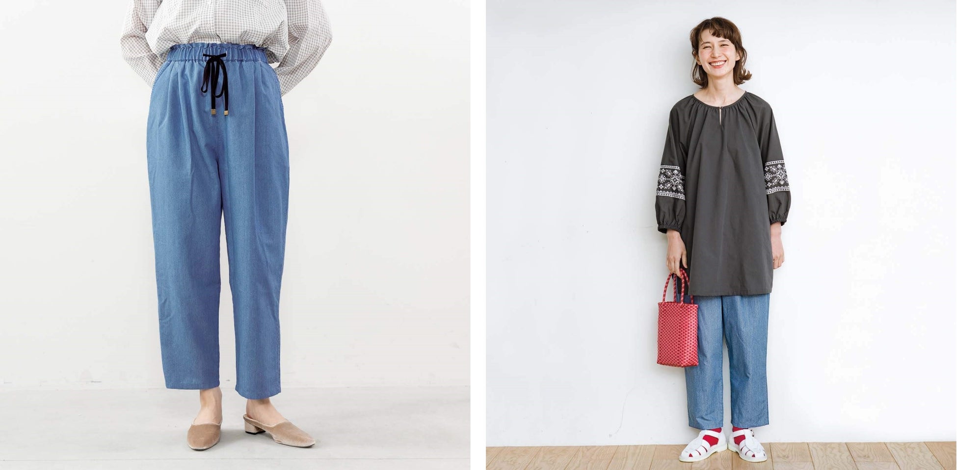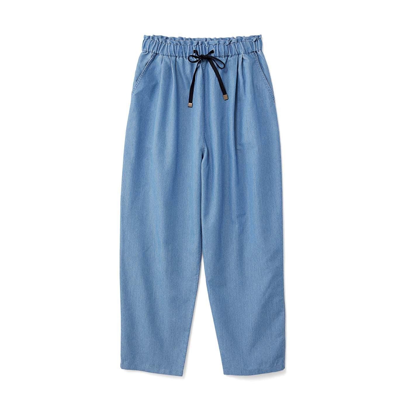 上品な張りとつや感を備えており、爽やかな印象を与える、薄くて軽やかな綿・ポリエステル混のデニムパンツです。また上深めのゆったりテーパードシルエットは、風通しがよく、暑い日でも快適に着用でき、様々なアイテムとのコーディネートを楽しむことができます。ワンピースやチュニックとの重ね着にも適しています。