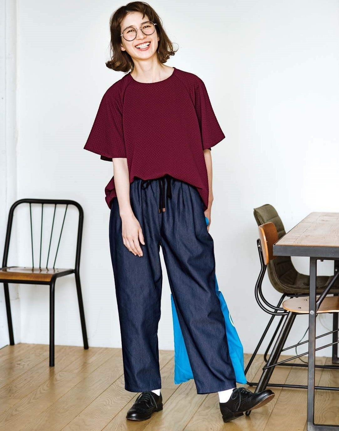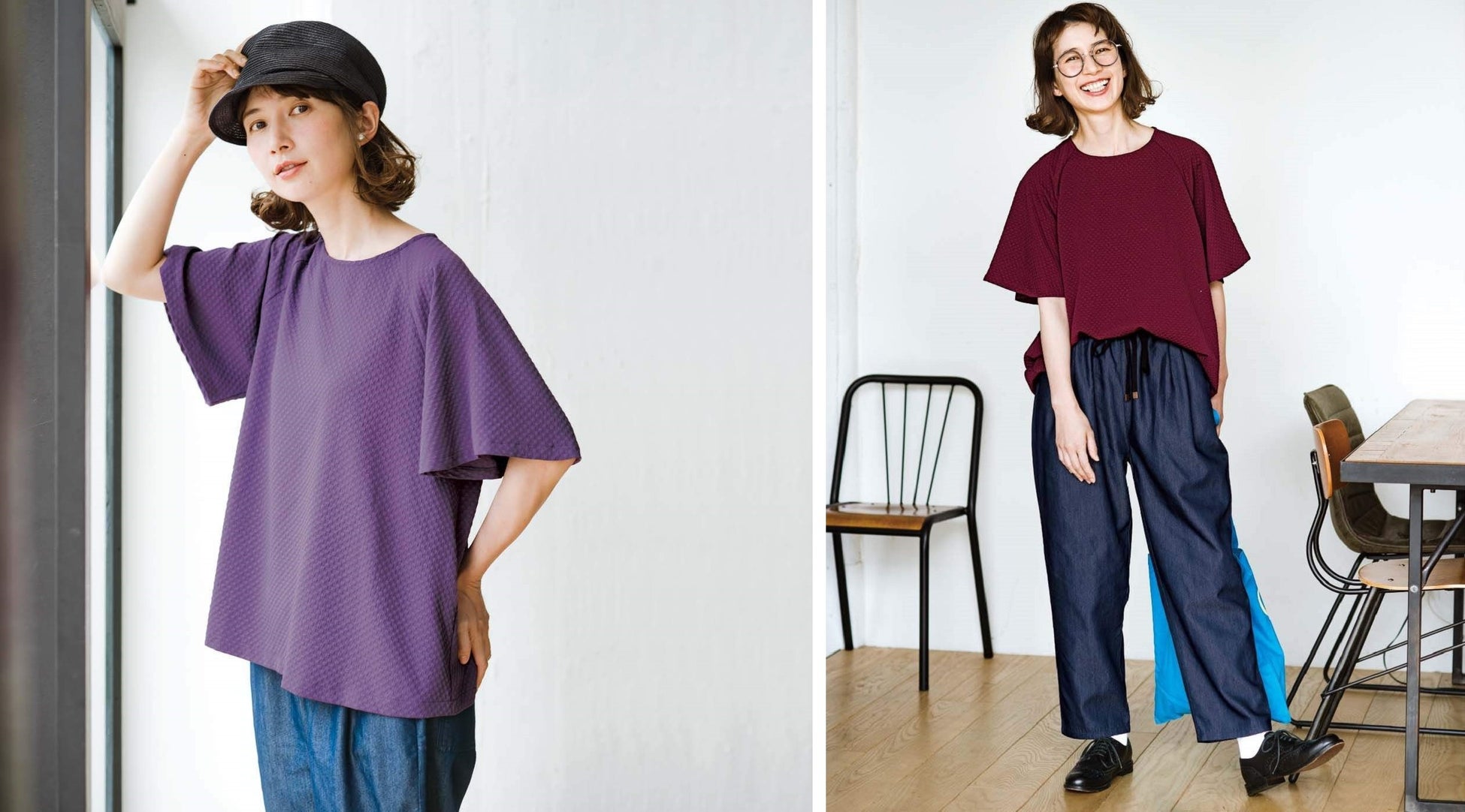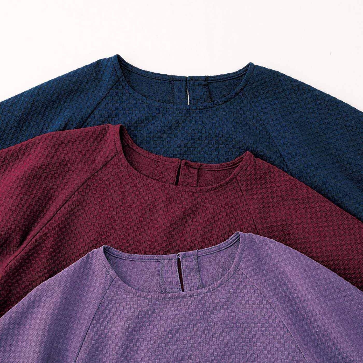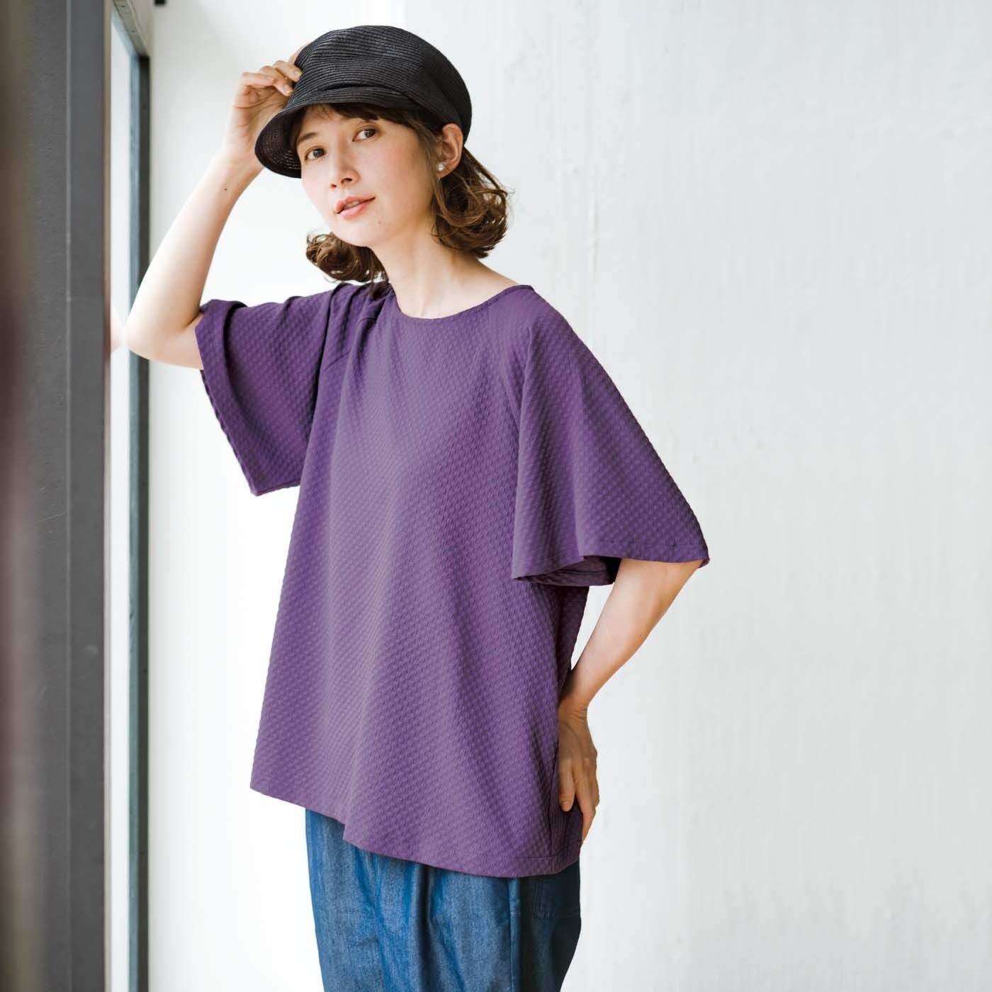 ぽこぽこの表面感とベリー色が特徴のトップスは、薄軽で肌触りが良く、さらっとした着心地です。洗いざらしのまま着られ、吸水速乾素材なので汗ばむ季節も快適です。気軽にスタイリングできる一方で、腰まわりをすっぽりカバーするデザインで、トレンド感もあり、さまざまなボトムスとのコーディネートを楽しむことができます。