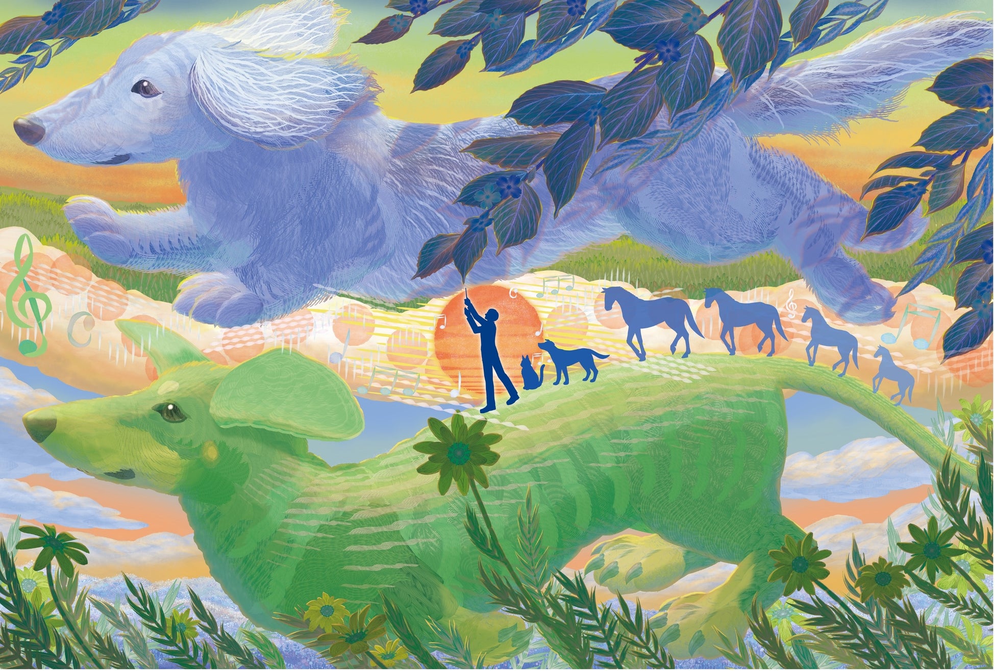 アメリカ出身でありながら、日本の映像作品に深い情感と繊細な美しさをもたらしてきたEvan Call。彼が自ら選曲・構成した珠玉の名曲の数々を、壮麗なオーケストラサウンドでお届けするコンサート、「エバン・コール/Evan Call Orchestra Concert 〜 音楽と旅の現在地」のメインビジュアルが決定しました。デザイナーhohobunさんによる描き下ろしのビジュアルは、2匹のダックスフントそれぞれの背景に二つの国(アメリカ、日本)を象徴した景色が描かれ、国境を超えて活躍するEvan Callをイメージ。中心に描かれたエバン・コールのシルエットを鮮やかな夕陽と飛行機雲が引き立てます。