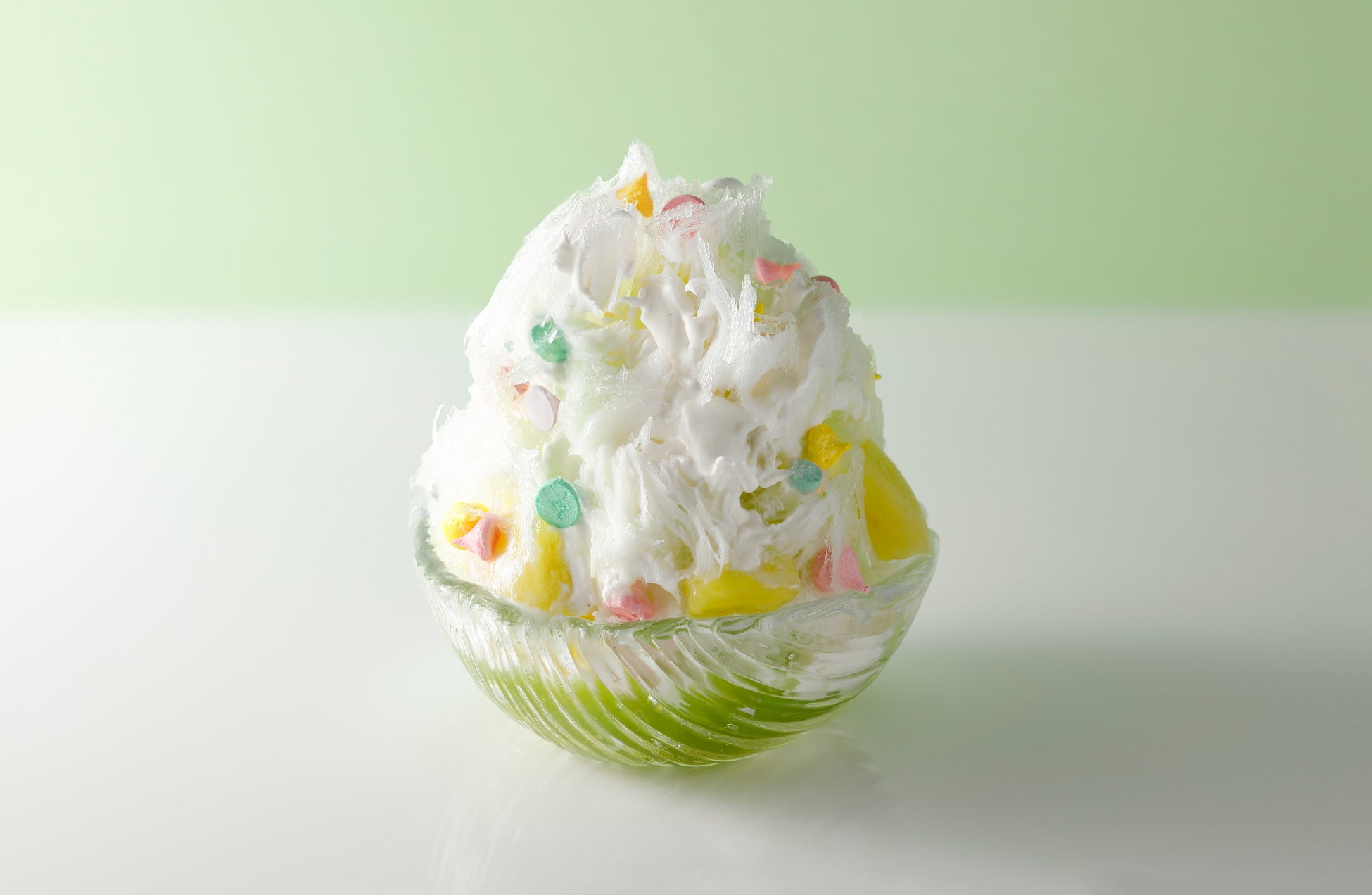 氷は綿菓子のようなふわっふわな柔らかさと、スッと溶けていく滑らかさが特徴の日光天然氷を採用。国産マスクメロンのごろっとした果肉、爽やかな酸味と甘みが凝縮されたマスクメロンジュレにメロンソース、さらにホテルニューオータニのシグネチャースイーツ「スーパーシリーズ」にも使用している大牟田産生クリームも加え、軽やかなショートケーキを思わせる極上スイーツに仕上げました。トッピングは、フレーバーの異なる4種のメレンゲを使用し、見た目も華やかに。ホテルでのひとときを、贅沢、涼やかにお過ごしください。