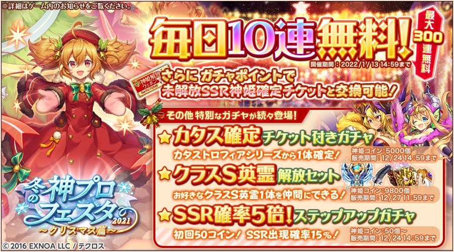 合同会社EXNOA(本社:東京都港区、CEO:村中 悠介、URL:https://games.dmm.com/)が運営するDMM GAMESにおいて『神姫PROJECT A』は、本日、『冬の神プロフェスタ2021(クリスマス篇)』の開催を発表した。さらに「キュベレー」「エリゴス」が期間限定のクリスマス衣装で登場したことも発表している。