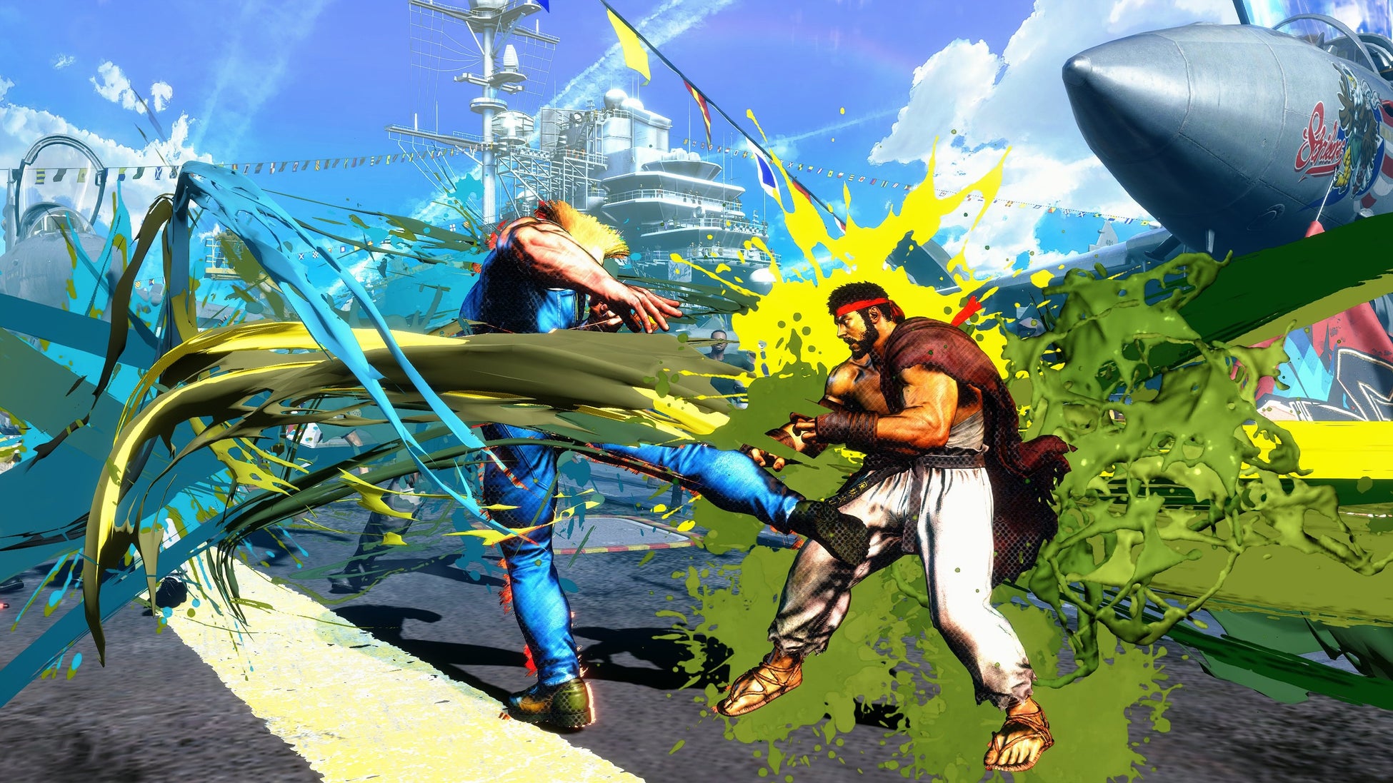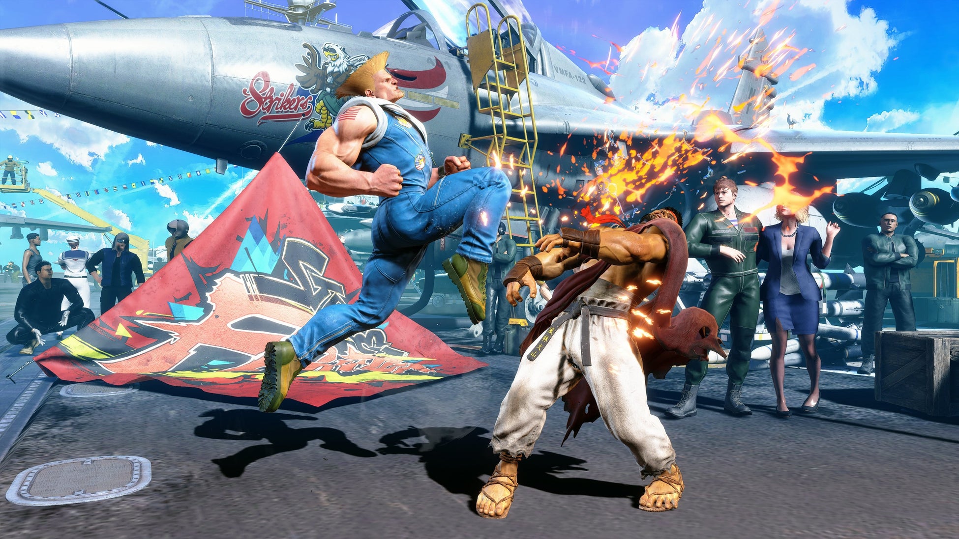 今回のガイルのステージは海上に浮かぶ空母。飛行中の飛行機、様々な国の国旗、そして陽気な見物人が登場。ガイルの新しいステージでバトルが繰り広げられる!