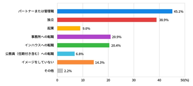 その結果、法律事務所や企業内においてパートナー弁護士や管理職といったキャリアを求める方が多いと同時に、弁護士としての独立や起業の希望者が多いことや、若手弁護士の半数が自分のキャリアを伸ばす上で個人受任や副業・兼業を求めていることが結果として示されました。