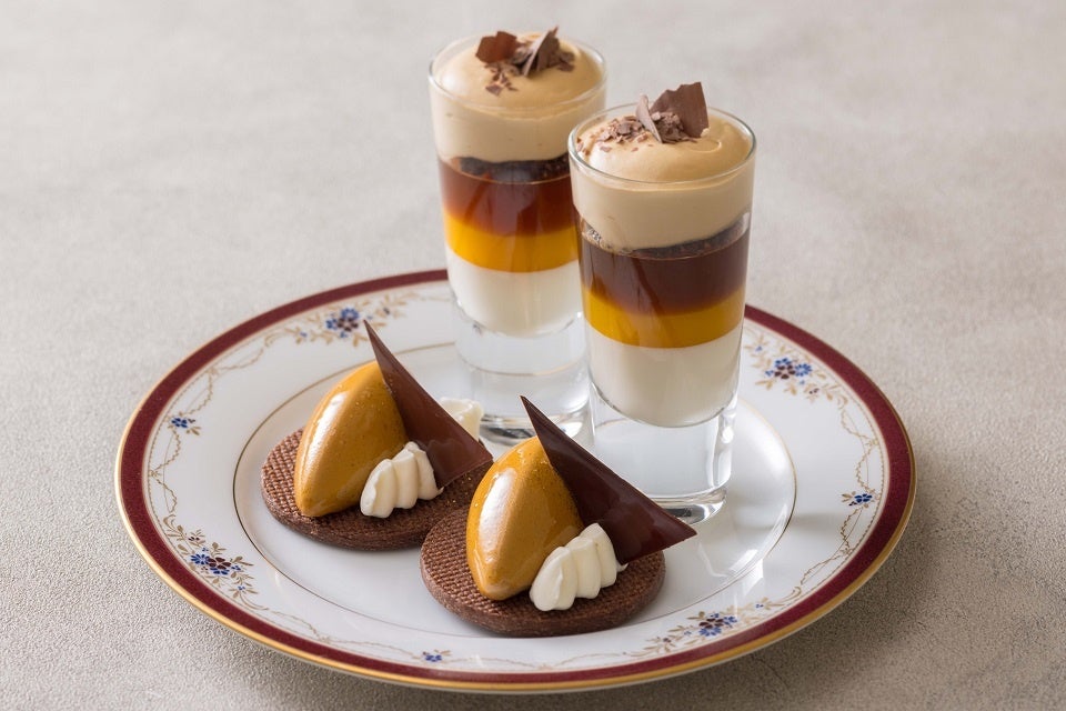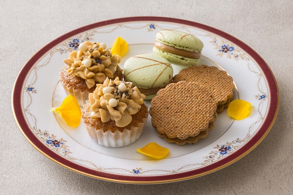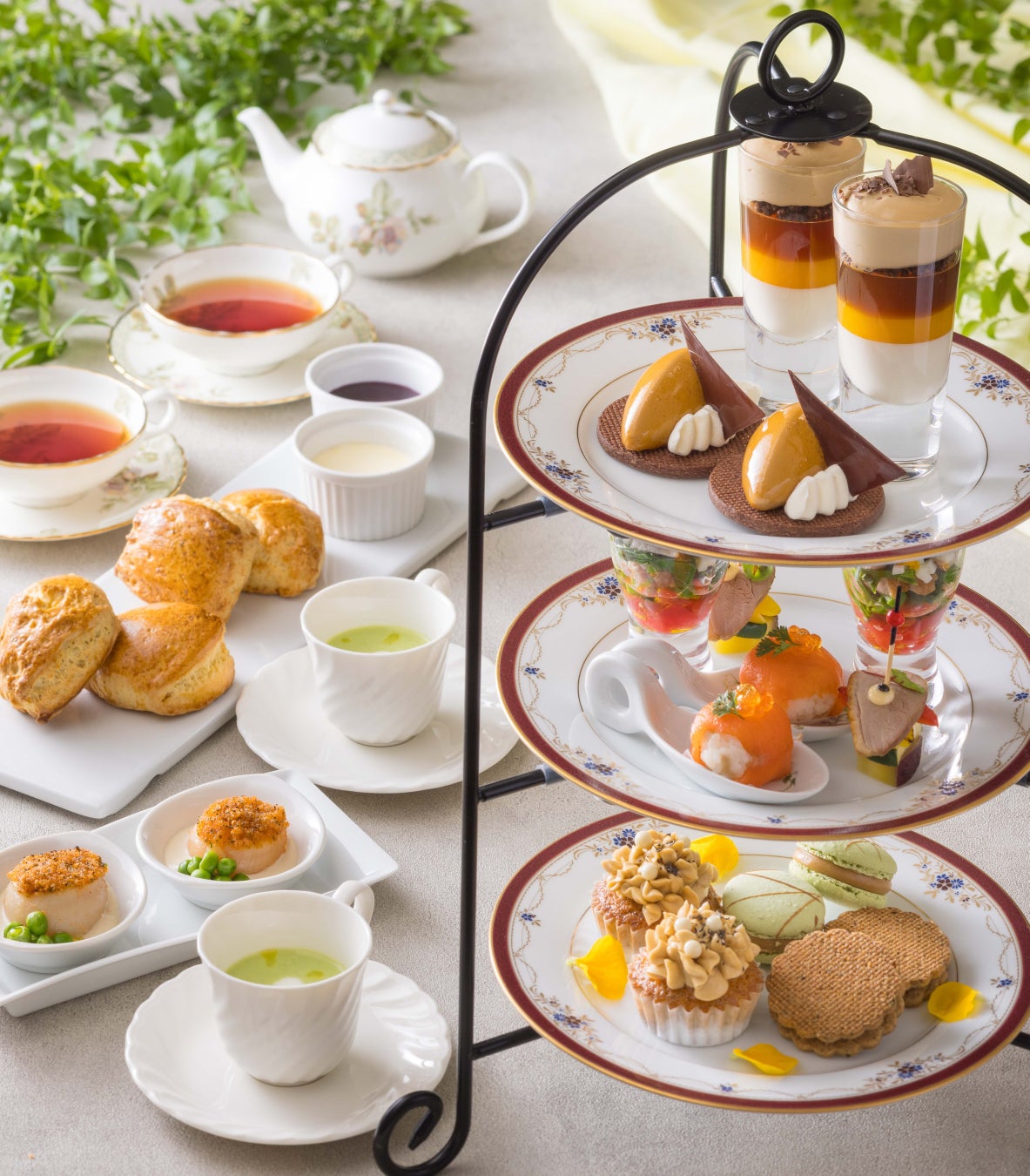 一口ごとに味の変化がお楽しみいただける「紅茶のベリーヌ」は、パンナコッタ、マンダリンオレンジジュレ、ココアクランブル、アールグレイクリームを重ねた見た目も美しい仕上がりです。さらに、“ころん”としたフォルムが可愛らしい「アールグレイのマカロン」や、濃厚なミルクチョコレートの味わい中に、アールグレイが香りたつ「ミルクチョコレートとアールグレイのムース」など、全てのスイーツにアールグレイを使用しております。柑橘系のすっきりとした味わいと香りが特徴のアールグレイは、これからの季節にもぴったりです。セイボリーには、枝豆を使用した「枝豆のポタージュスープ」や、桜海老の風味が際立つ「帆立貝の桜海老パン粉焼き ノルマンドソース」など、旬の食材を用いたメニューもご用意いたします。