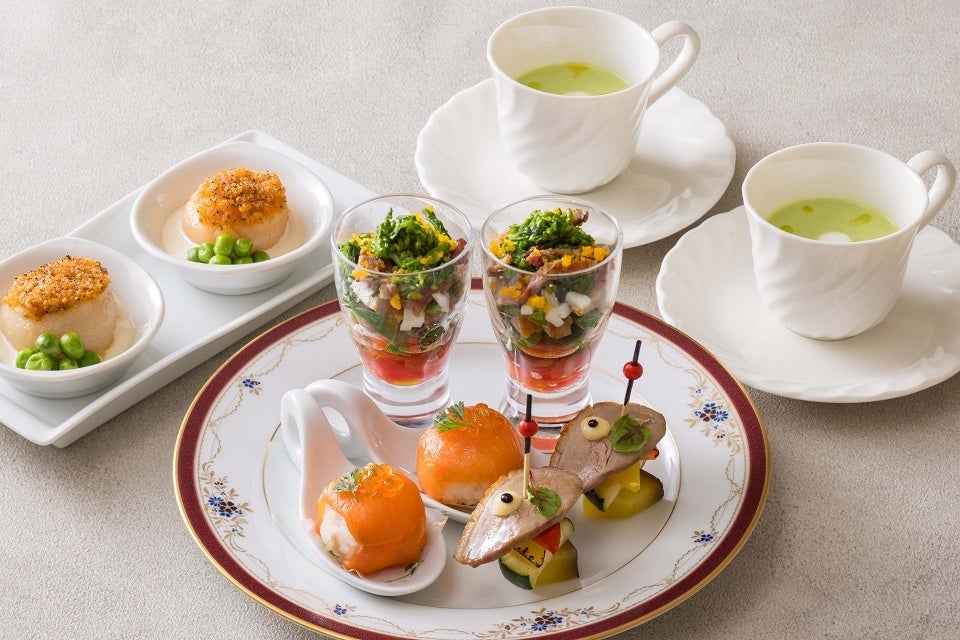 スモークサーモンとクリームチーズの手毬寿司、帆立貝の桜海老パン粉焼き ノルマンドソース、クリスピーベーコンと菜の花のメリメロ、紅茶鴨のピンチョス、枝豆のポタージュスープ