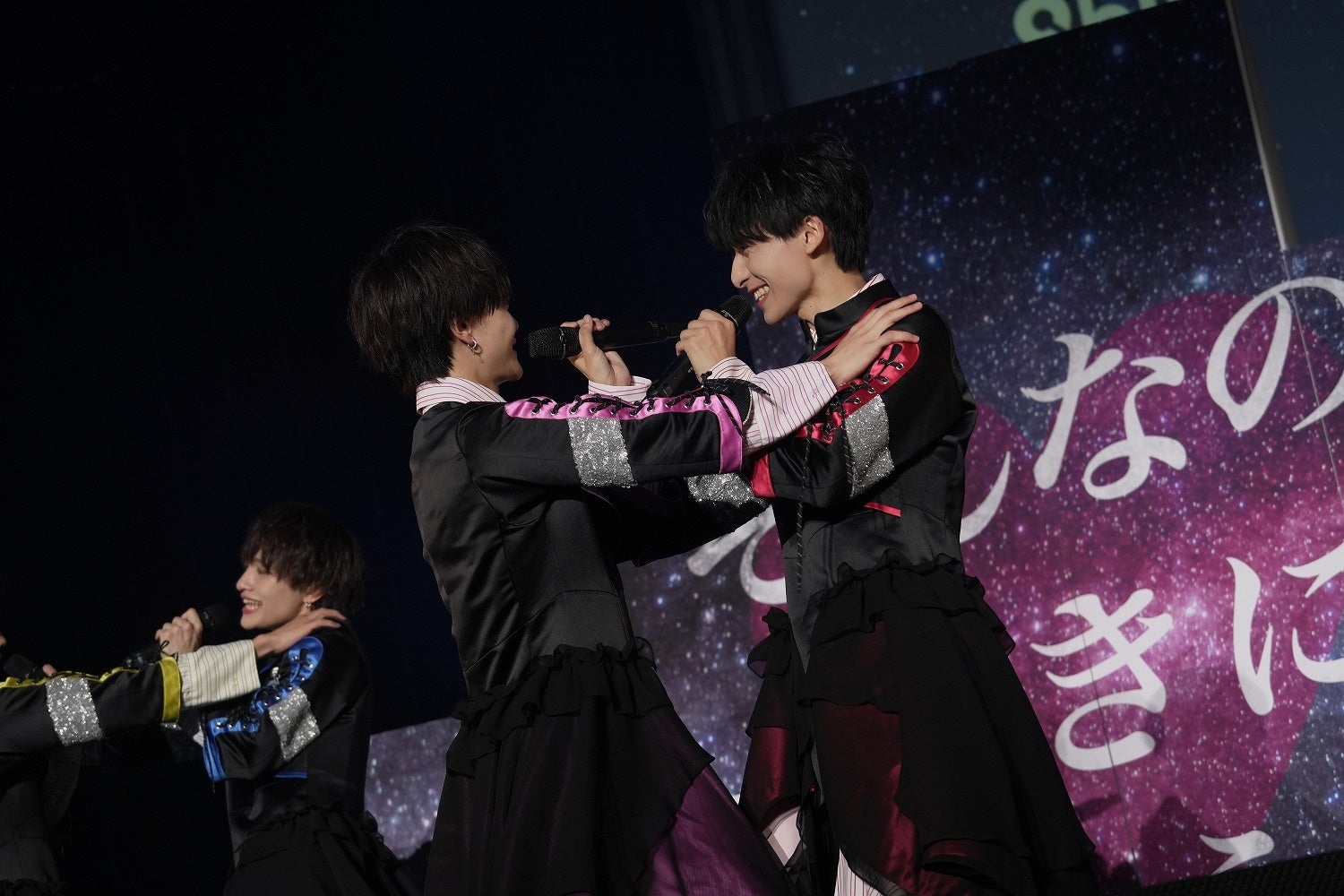 「proof」が投入される頃には、すっかり6人の緊張も解けた様子。声量がググッとあがり、一挙手一投足に個々のアイデンティティが乗る場面も増えてきた。カメラに抜かれた黒澤胤也(くりさわ・かずや/赤担当)は、踊りながらニコッとはにかみ、オーディエンスを悩殺。そんな笑顔にクラクラさせられたのもつかの間、ステージ上のブロックがくるっとひっくり返り「そんなの好きになっちゃうじゃん。」の文字が出現すると、さらなる歓声が沸き起こった。
