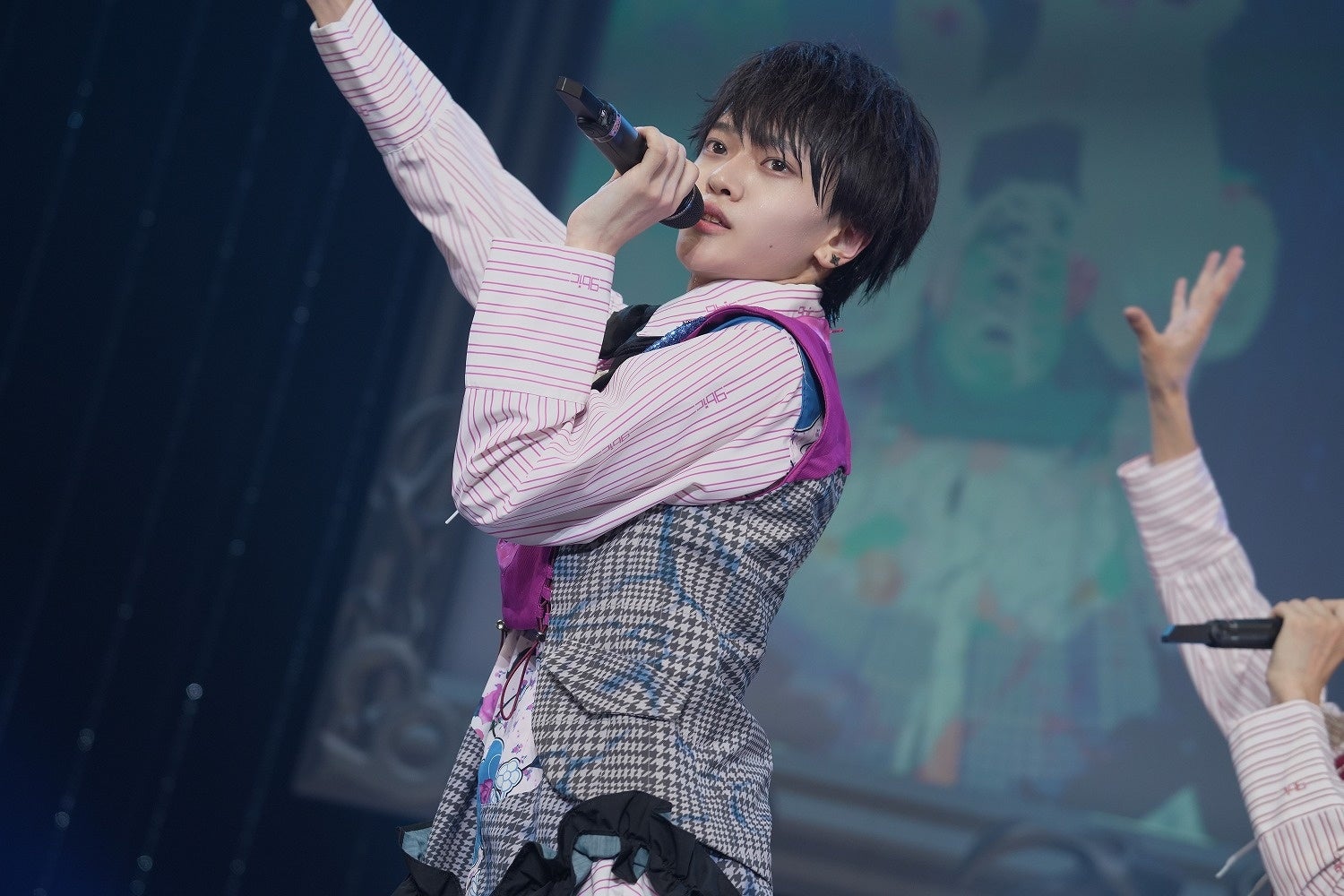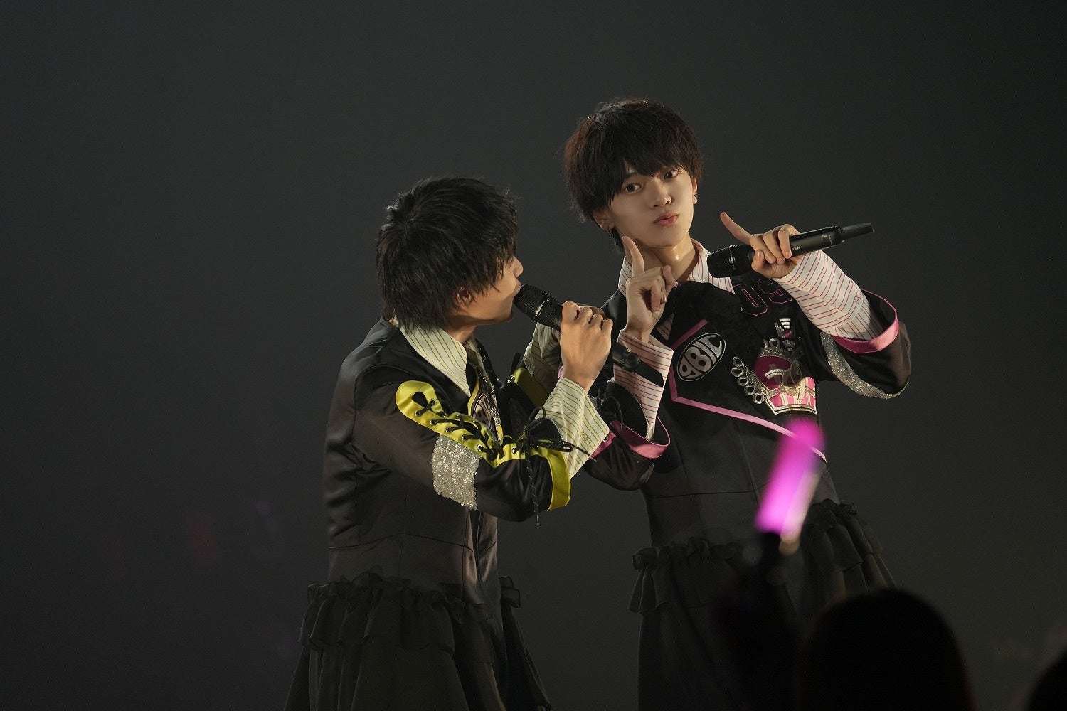 登場するやいなや、「みなさん、最後まで楽しんでいきましょう!」と焚きつける三波斗。メンバーが変わっても、盛り上げ隊長なのは変わらない。自身の緊張を吹き飛ばすように、グループの士気をさらにあげるように、会場へ呼びかける。オープニングを飾ったのは、新体制で初リリースとなった「YELL」だ。矢野旺士朗(やの・おうしろう/黄色担当)がキラキラスマイルを炸裂させたかと思えば、佐々木大河(ささき・たいが/ピンク担当)はキュートな猫ポーズで魅了。ステージに立つ6人は、どこか緊張を感じさせるものの、それぞれの思うアイドルを精一杯に開花させている。曲終わりには銀テープも噴射され、ここから怒涛のパフォーマンスが繰り広げられていくことを予感させた。