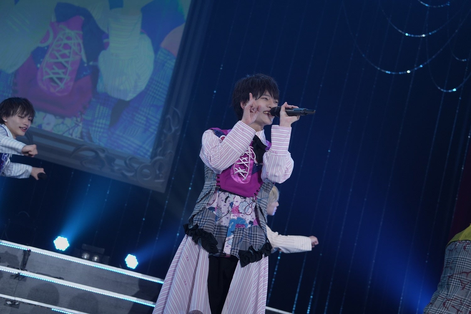 自己紹介をするMCに続いて投下されたのは、「9bic melody 1st(新体制)」。花道を通ってセンターステージへ移動した9bicが、クルクルと回転しながら各々を紹介する歌詞をキャッチーに歌い上げる。西山海斗(にしやま・かいと/オレンジ担当)が「俺についてこい!」と男らしい一面を覗かせたと思えば、和泉颯人(いずみ・はやと/青担当)は透き通った歌声を伸びやかに届ける。曲中ではメンバーの顔つきプラカードも掲げられ、それぞれのキャラクターを鮮明に印象付けた。