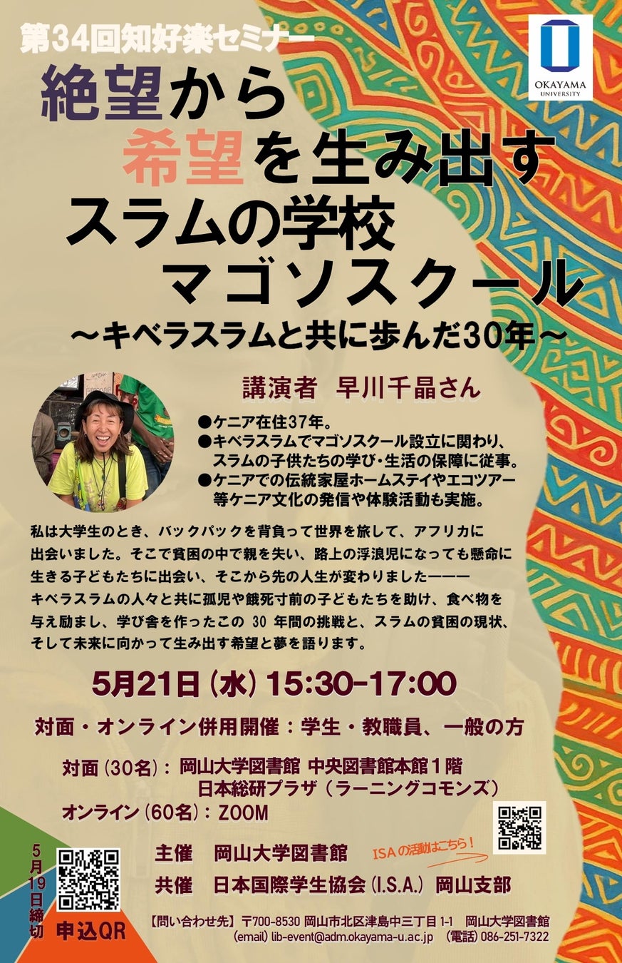 【岡山大学】岡山大学図書館 第34回知好楽セミナー「絶望から希望を生み出すスラムの学校・マゴソスクール~キベラスラムと共に歩んだ30年~」〔5/21,水 ハイブリッド開催〕