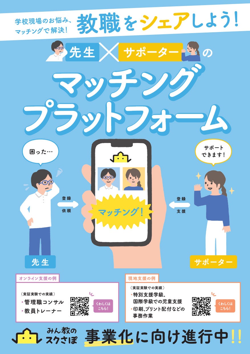 「みん教のスクさぽ」 学校現場の人手不足解消を目指す新規支援事業。質の高い人材と学校を結ぶマッチングを行い、教室支援や事務補助、教員育成・コンサルなどを提供。2027年度の本格始動に向け、現在実証実験を実施中です。