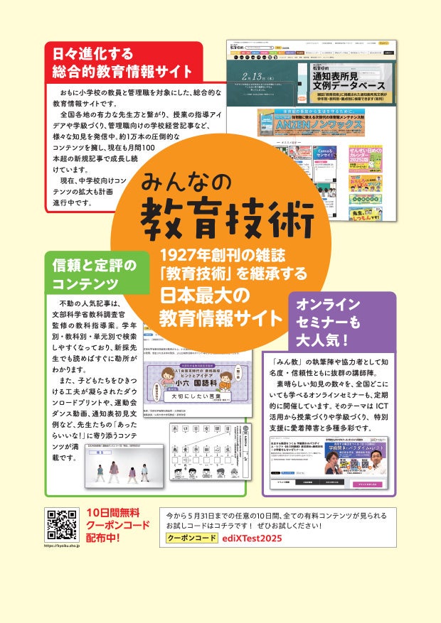 「みんなの教育技術」 小学館の教師向け雑誌『教育技術』を継承した国内最大級の教育情報サイト。文部科学省教科調査官の監修による学年・教科別の指導アイデアや、通知表所見文例、「みん教相談室」など、信頼性の高いコンテンツを提供しています。