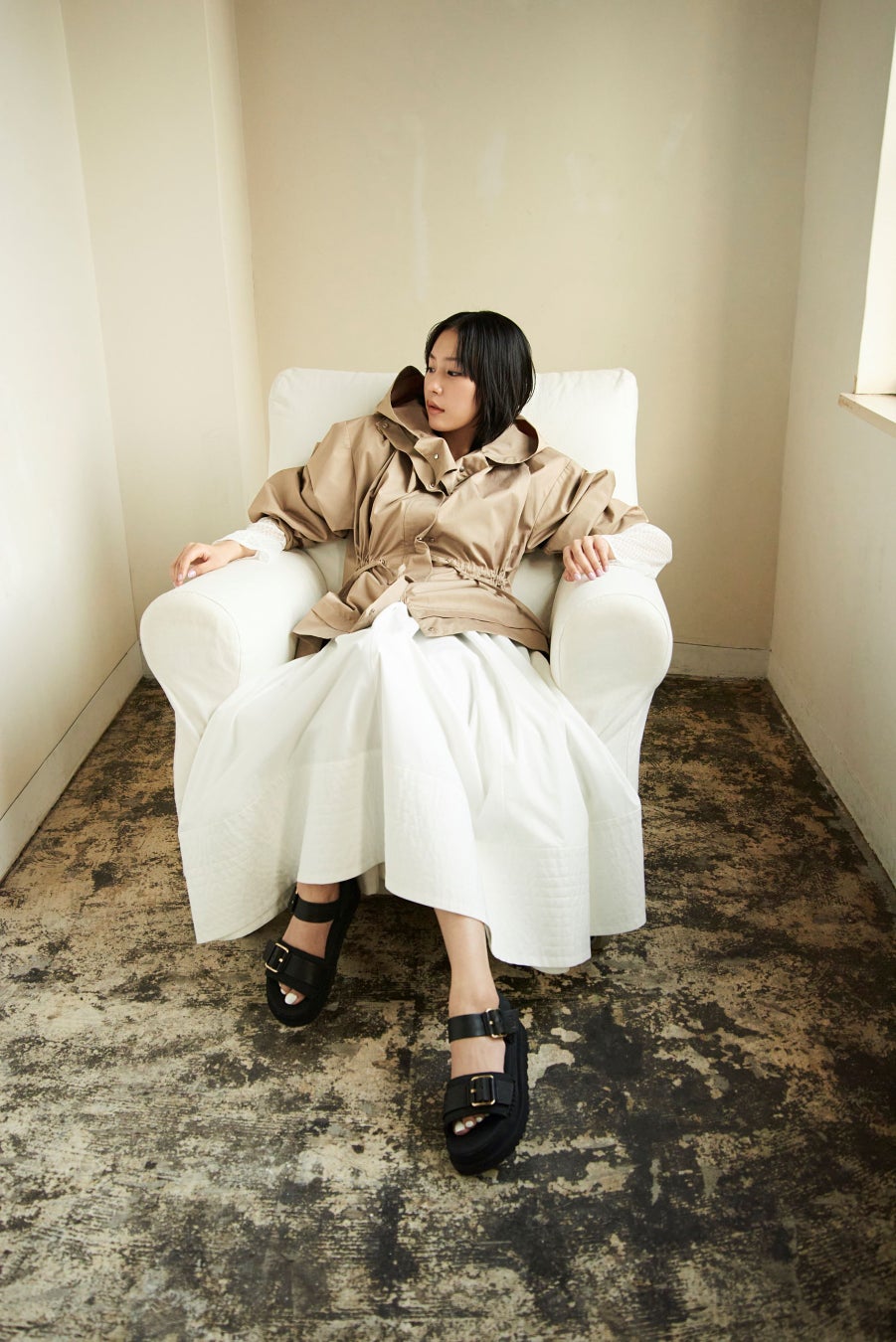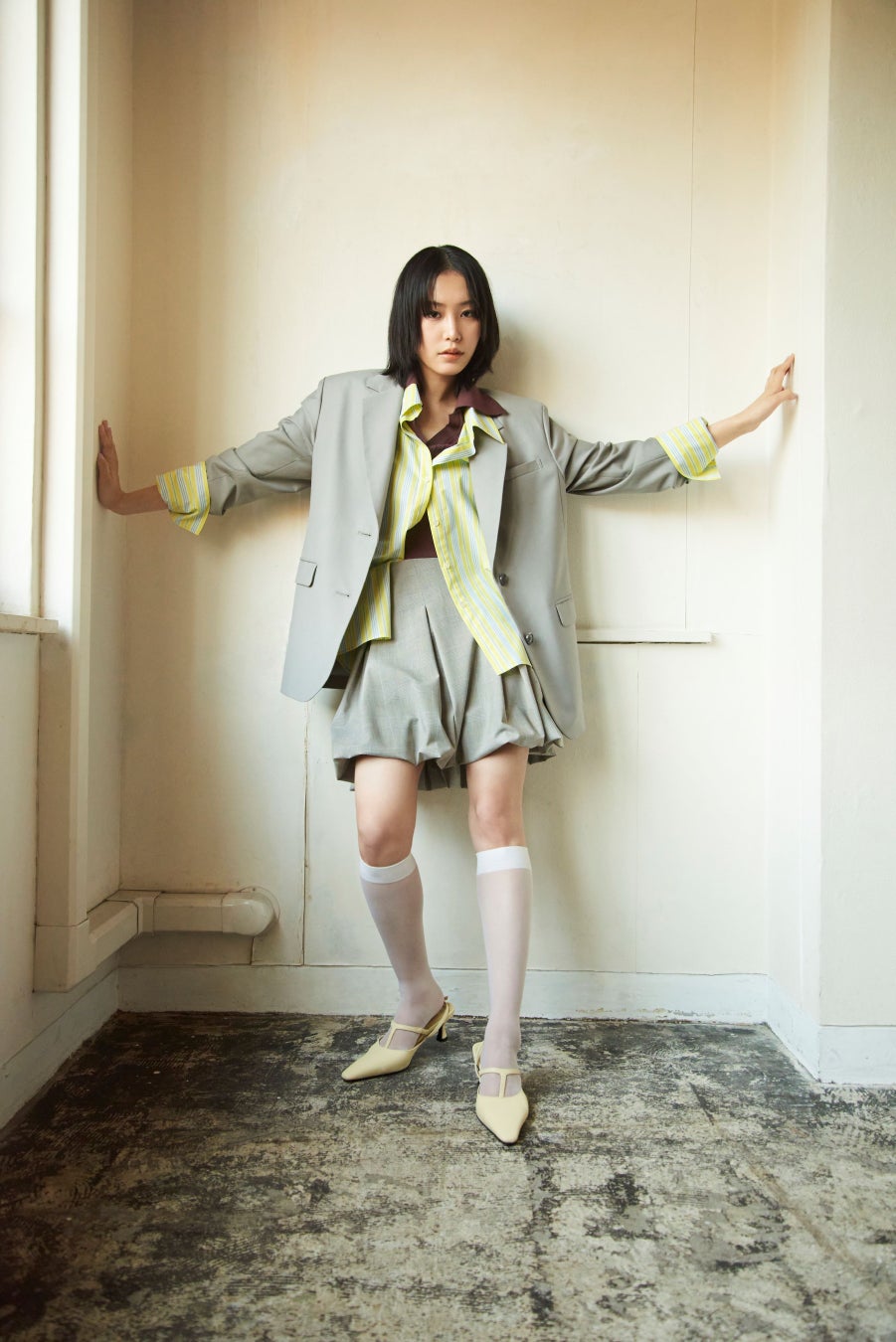 つや感と落ち感ののあるツイル生地で作ったオーバーサイズジャケットに、大きめの衿がモードなポロカラーニットと胸にワンポイントとしてロゴ刺繍を施したオーバーサイズシャツとのレイヤードを楽しめるスタイル。今シーズンも外せないトレンドのバルーンスカートと合わせて女性らしさもプラスして。
