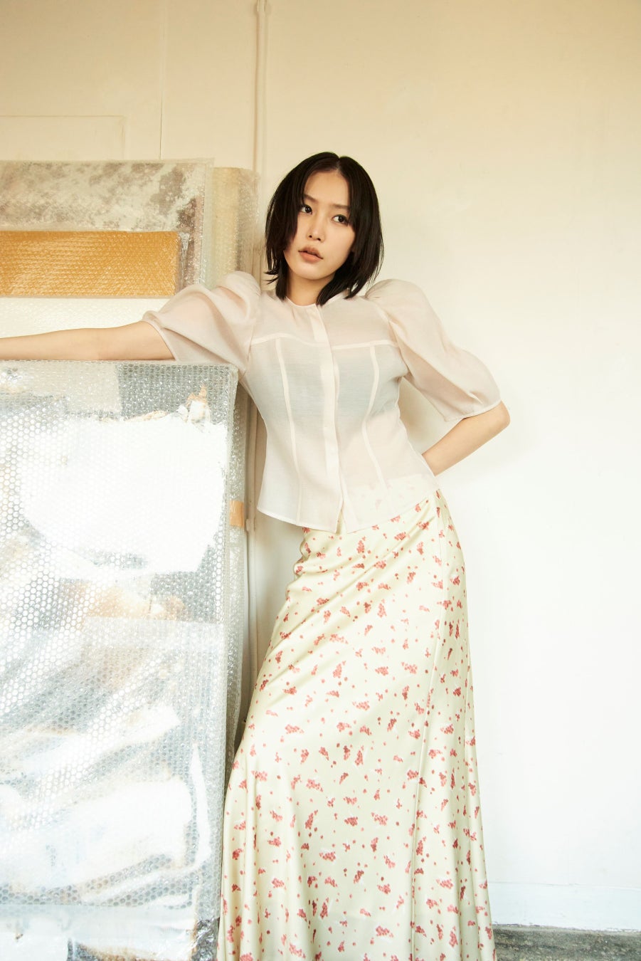 ボリュームのあるタックパフスリーブとコンパクトなボディのバランスが絶妙なブラウス。春らしい花柄プリントのスカートと合わせて大人フェミニンスタイルに。