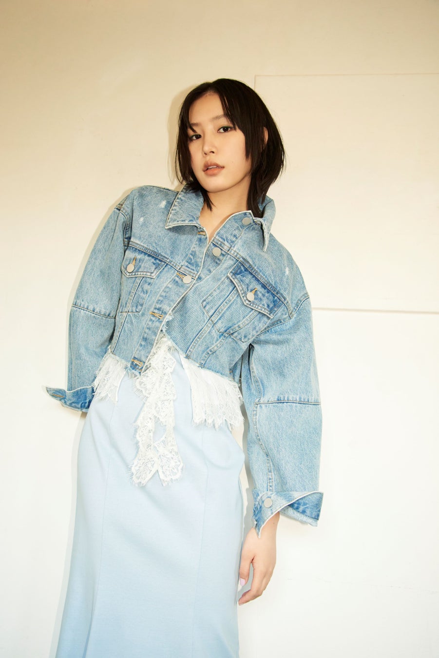 ビックシルエットをショート丈にすることにより、トレンド感と程良くヘルシーな印象を与えてくれるデニムジャケット。様々なモチーフのレーステープを使用した遊び心溢れるブラウスとカットソー素材を使用した体のラインを美しく見せるナローマーメイドシルエットの女性らしいアイテムを合わせることで大人カジュアルなコーディネートに。