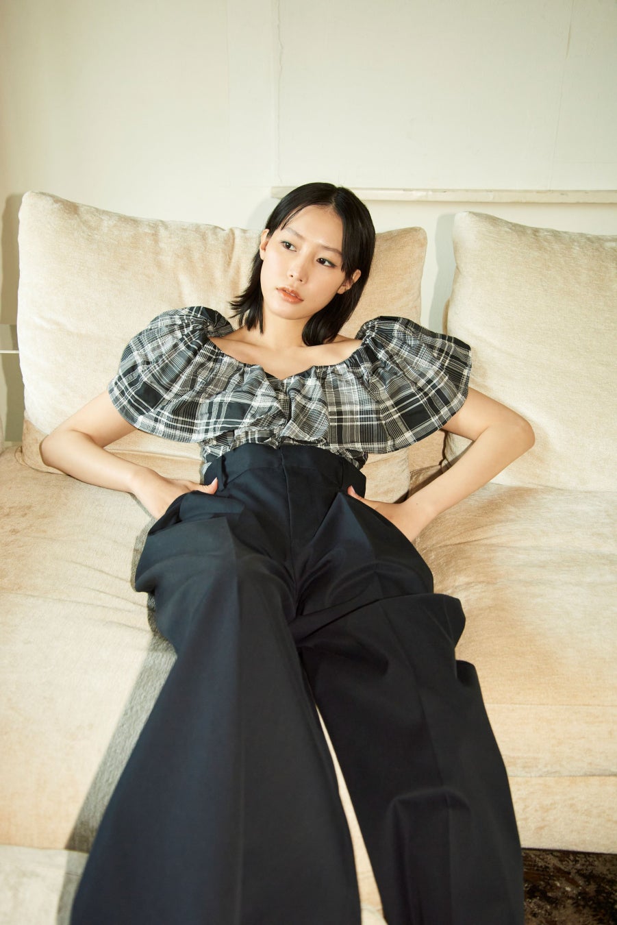 構築的なラッフルデザインのブラウスに、程良いハイウエストと2タックのワイドシルエットで脚を細長く見せてくれるチノパンツでキレイめスタイル。