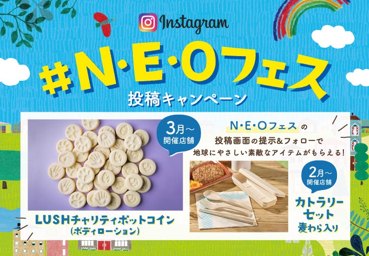 「N・E・O(ネオ)フェス」での体験や購入品などをインスタグラムに投稿し、マルイ公式インスタグラムをフォローいただくと、地球にやさしい素敵なアイテムが必ずもらえるキャンペーンを開催いたします。