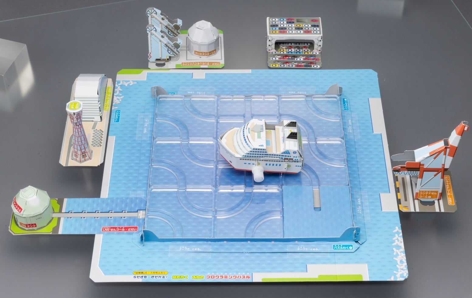 遊び方は、最初にお気に入りの船を決めてスタート。それぞれの船には、それぞれ目的地がセットで付いていて(たとえばコンテナ船の目的地には巨大なクレーンがあるコンテナターミナル)、航路となる8枚のクリアパネルを目的地に着くよう組みます。上手にパネルを組んで目的地に着けば航海成功! パネルを組み換えれば目的地も航路も自由自在。それぞれの船の役割を学べるとともに、プログラミングの基礎も学べる仕掛けになっています。