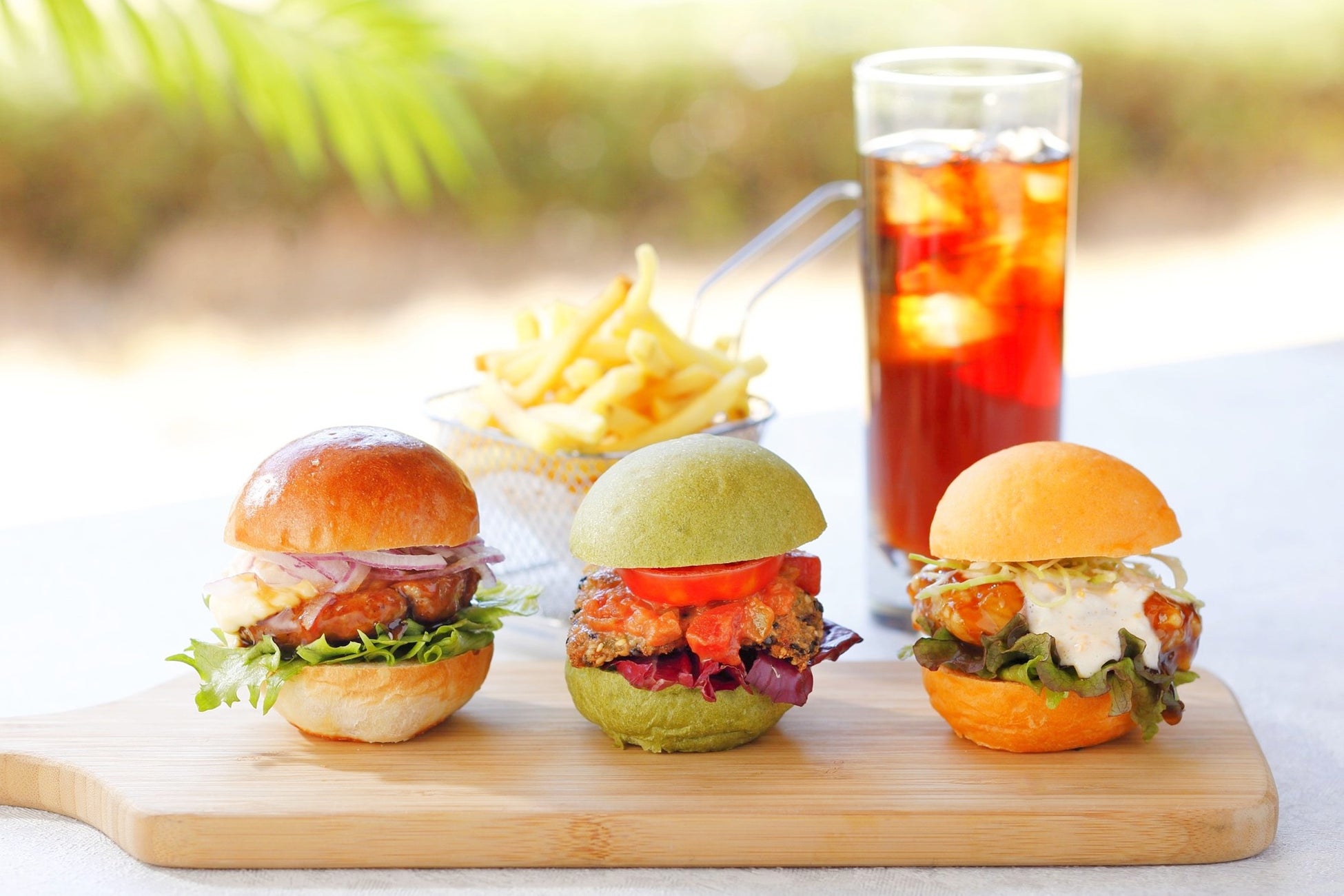 「3色スライダーバーガー」では、ふんわり香ばしいプレーンバンズには甘辛い自家製ソースが香る「テリヤキ」、鮮やかな緑色のほうれん草バンズにはサクサク食感とタルタルソースが絶妙な「フィッシュフライ」、ほんのりオレンジ色に色づいたトマトバンズにはまろやかな酸味がクセになる「チキン南蛮」の3つの味わいと彩りがひと皿でお愉しみいただけます。