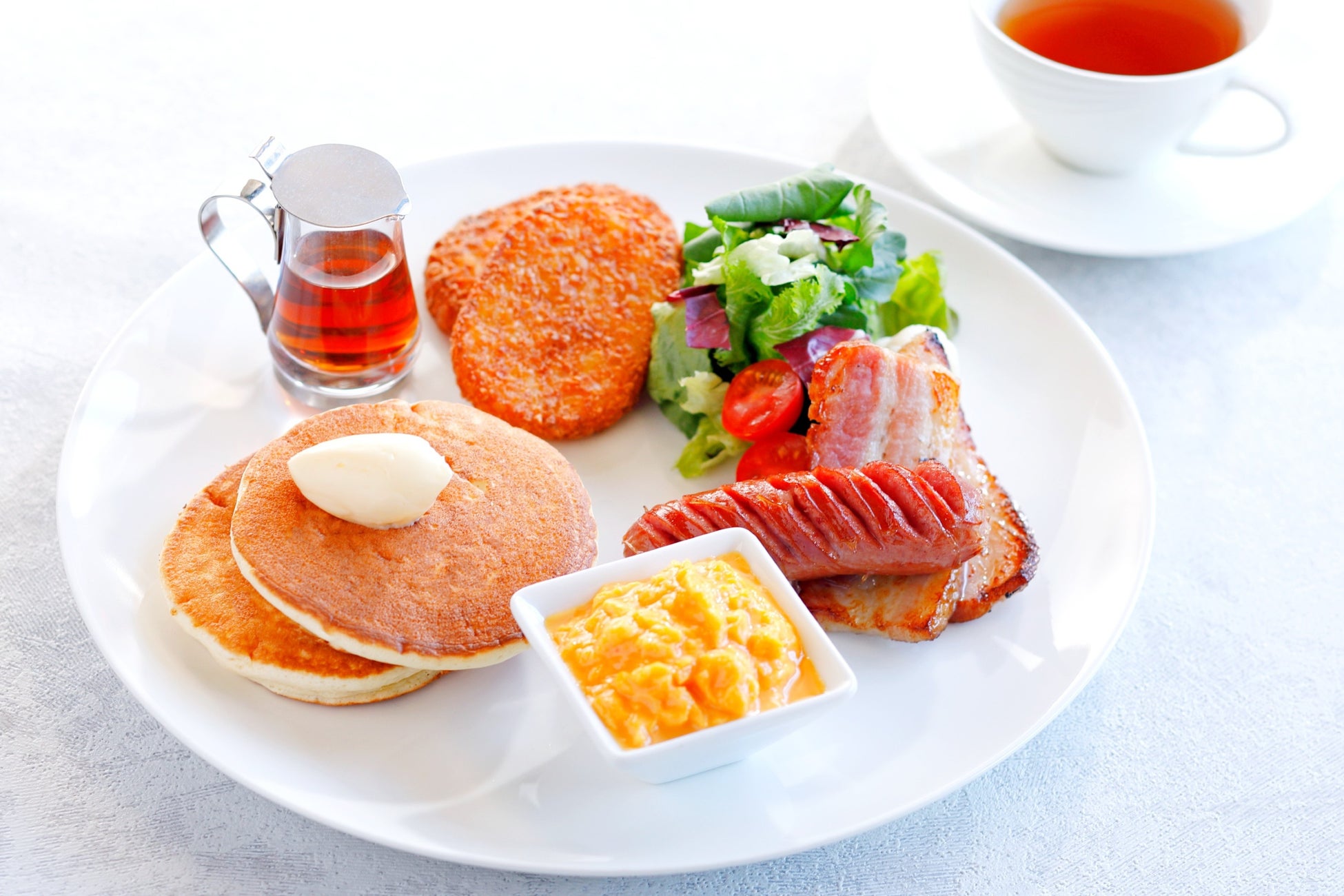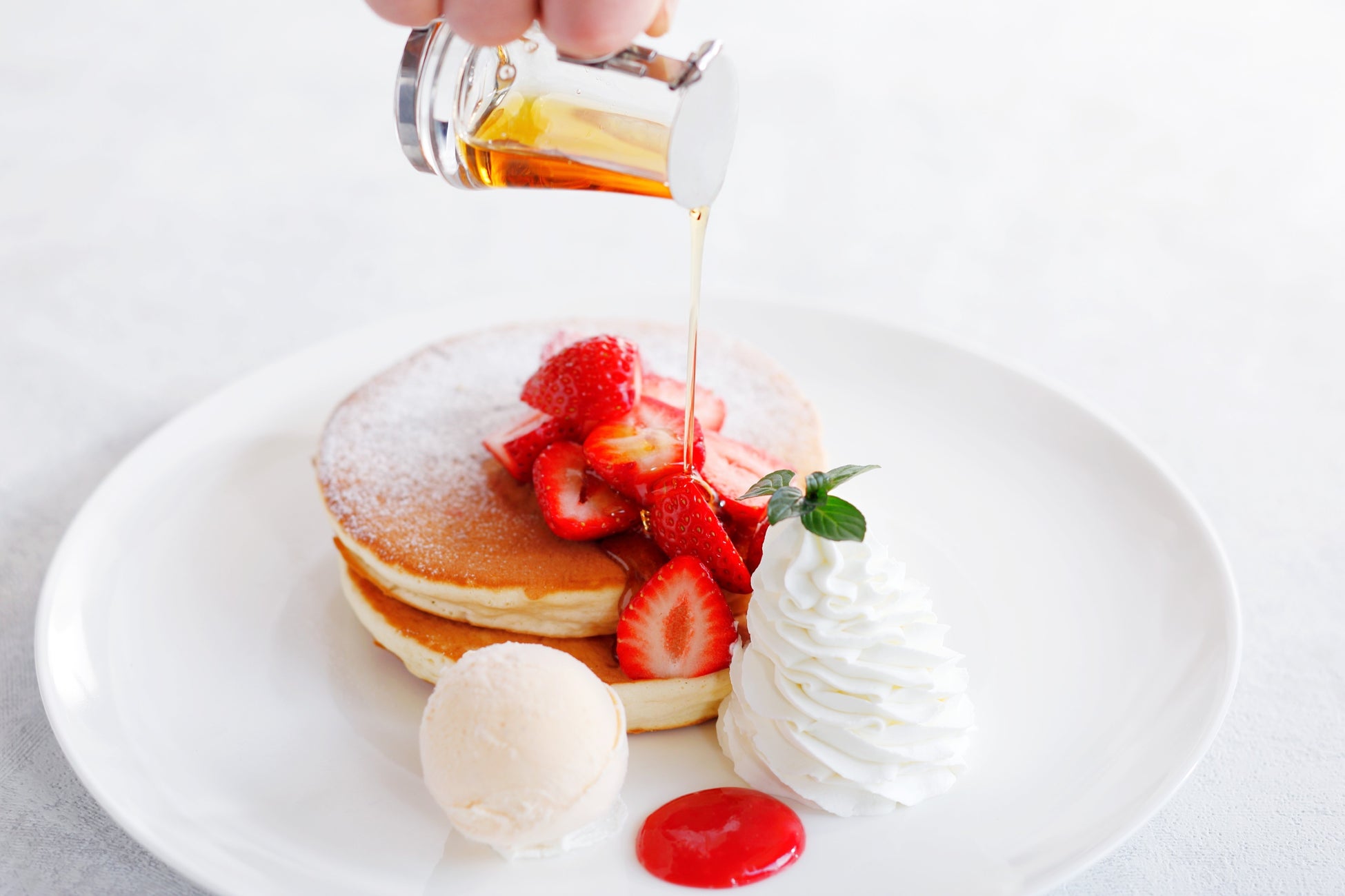 また、ふんわり焼き上げたパンケーキに、ジューシーなグリルソーセージ、香ばしいベーコン、ふわとろのスクランブルエッグ、彩り豊かなサラダ、そしてホクホクのポテトを添えた「パンケーキプレート」や、ふんわり焼き上げた2枚のパンケーキに、みずみずしいカットいちごをたっぷりと散りばめ、いちごとメープルの2種類の特製ソースをとろりとかけていただく「いちごのパンケーキ」をご用意。