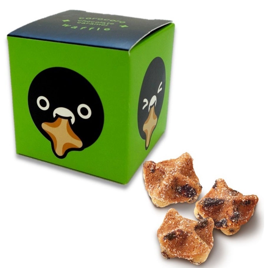 ワッフルケーキの店として知られる「R.L waffle cake」の「コロコロワッフル」は、ワッフルベーカーで焼き上げたかわいいひとくちサイズの焼き菓子。チョコキャラメル味はキャラメル風味のサクサクとした生地とチョコチップのザクザク感がくせになるおいしさです。Suicaのペンギンが描かれたキューブ型パッケージは愛らしく、開ける瞬間から楽しい気分に。食べ切りサイズで持ち運びやすいので、プチギフトにも喜ばれる一品です。
