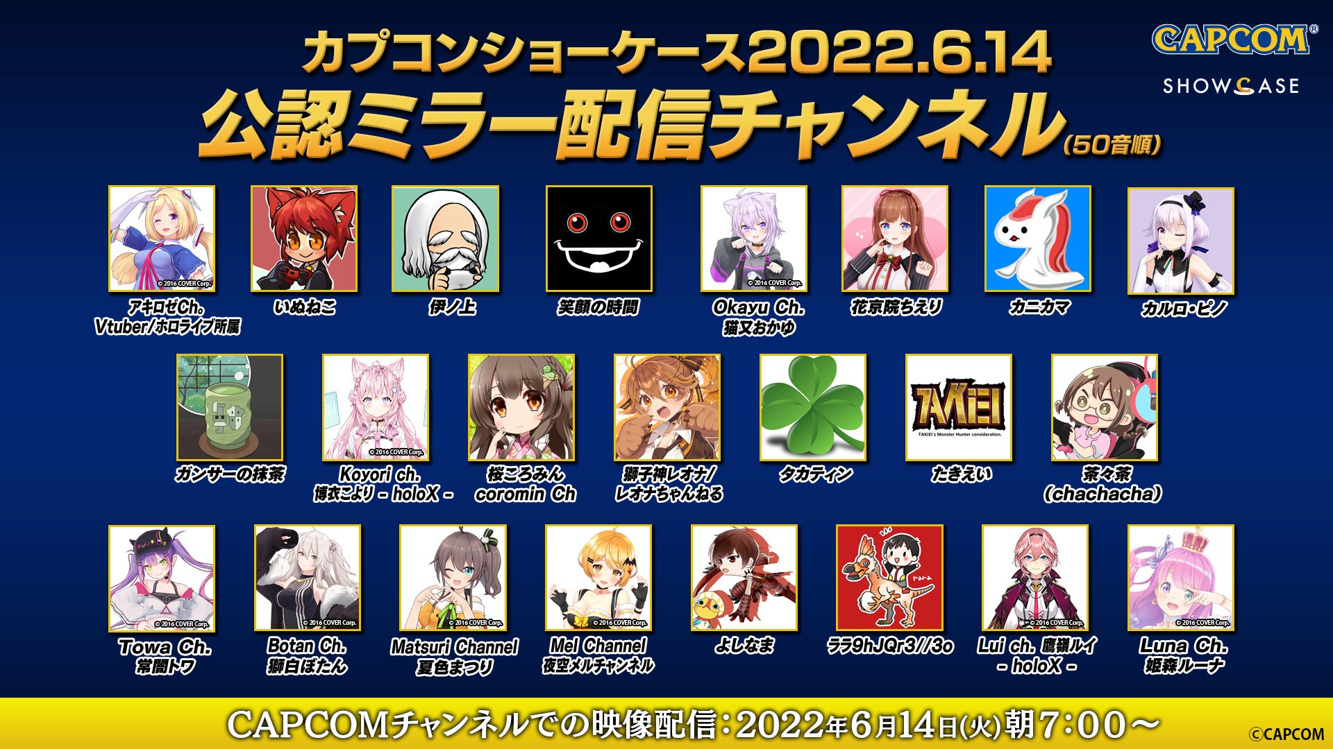 さらに、人気配信者と一緒に番組を楽しむ公認ミラー配信も実施。公式の配信チャンネルでご覧になるのも、お好きな配信者さんと一緒にもりあがるのも、皆さまのお好みで「カプコンショーケース」をお楽しみください。
