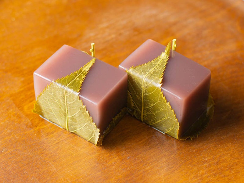 丹波工場で炊き上げたこし餡を使った水ようかんを、塩漬け桜葉で巻きました。