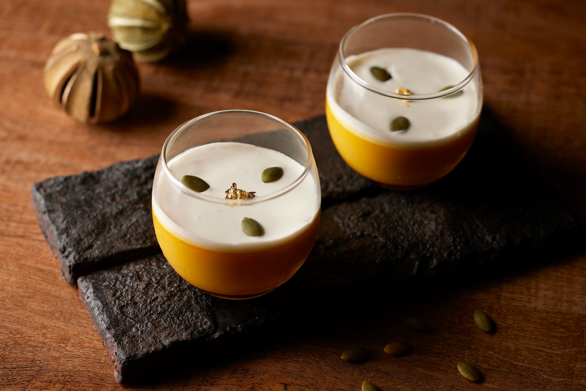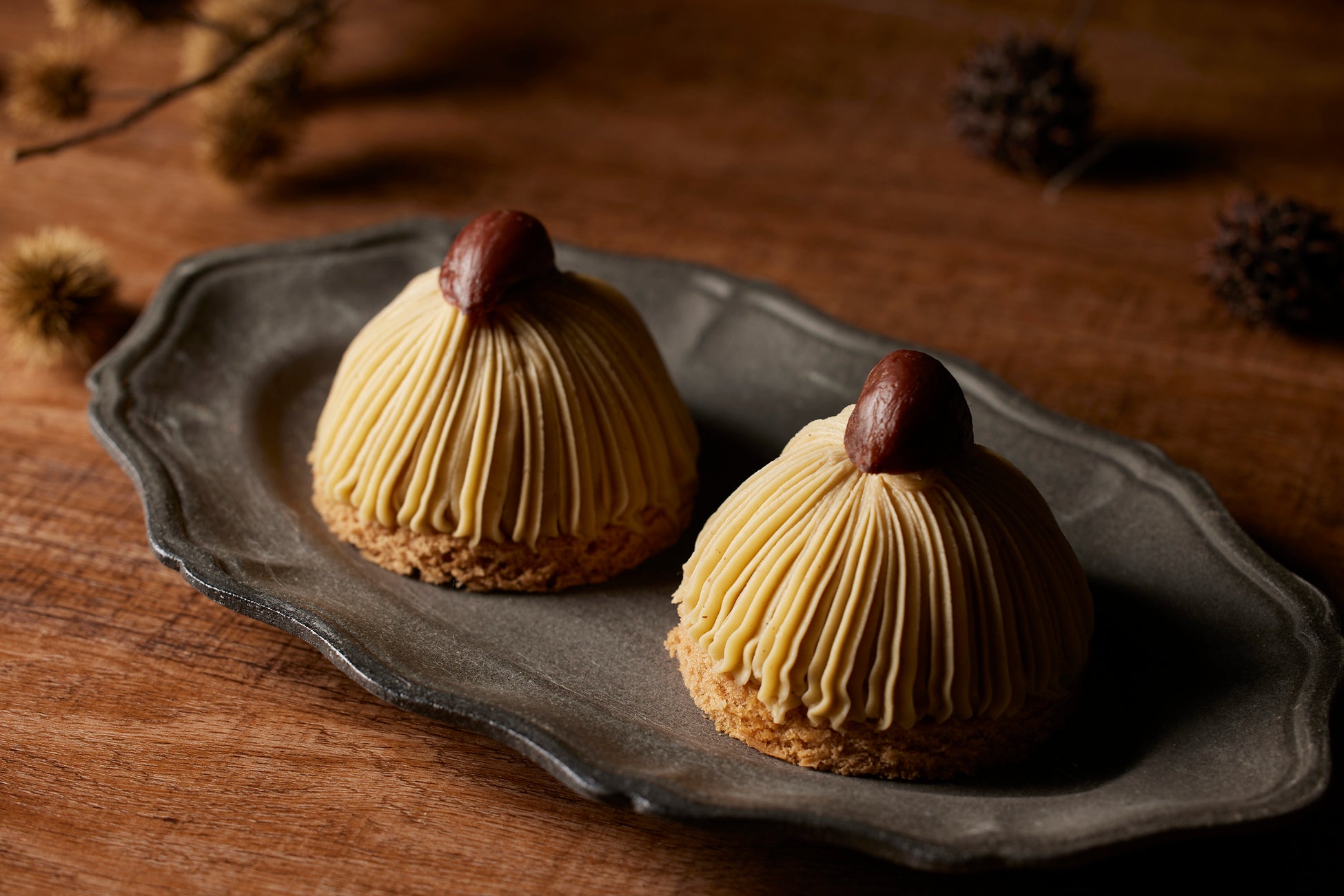「和栗のモンブラン」は、しっとりと焼き上げたほうじ茶の風味香るスポンジにきな粉のクリームと黒蜜のゼリー、栗の渋皮煮と和の食材を取り合わせました。仕上げに香り豊かな和栗のモンブランクリームで包み、トップにも和栗を一粒乗せ、多様な食感と味わいがお楽しみいただける和テイストなモンブランです。「かぼちゃプリン」は、国産かぼちゃのプリンと純白のシャンティクリームのなめらかな口当たりがお楽しみいただけます。金箔とかぼちゃの種をあしらい、シンプルながらも濃厚な味わいをご堪能いただける一品です。