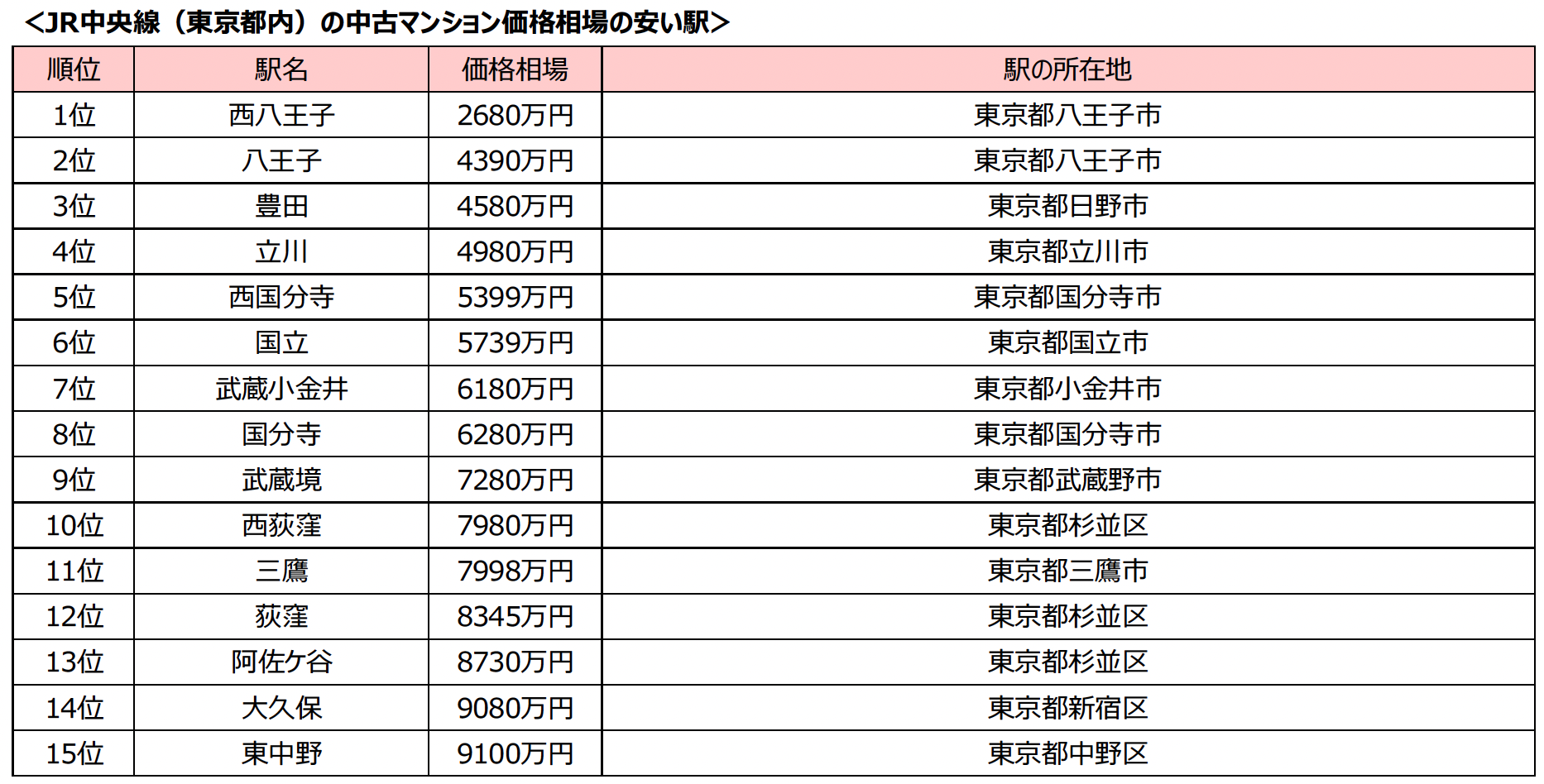 JR中央線中古マンション価格相場の安い駅2025年 1位は西八王子駅で価格相場2680万円、注目の駅も紹介