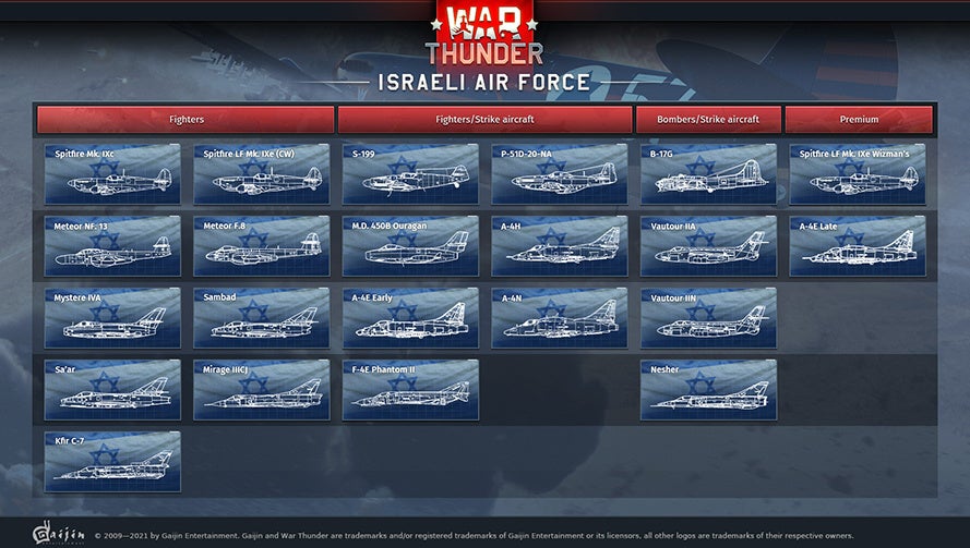 現在、イスラエル空軍ツリーはクローズドベータテスト(CBT)中です。限定デカール「Emblem of the Israeli Air Forces(イスラエル空軍の紋章)」が貰えるゲーム内タスクを達成するとクローズドベータテストへ無料参加することが出来ます。ゲーム内タスクを達成する時間が惜しいプレイヤーは、CBTアクセス権付きイスラエル空軍プレミアム機体の購入により即座に参加も可能です。詳細は下記の記事をご確認ください。