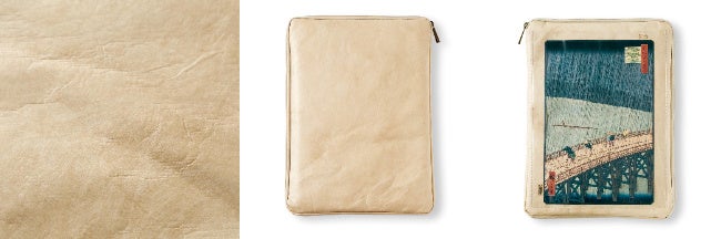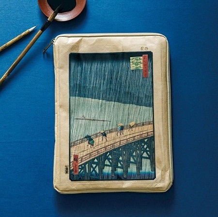 風景画の名手と言われた歌川広重の作品の中でも、人気の高い「名所江戸百景〈大はしあたけの夕立〉」をモチーフにしたファイルポーチです。紙のような風合いに仕上げ、作品に描かれた構図の魅力をより感じられるように、外ポケットとポーチ本体に絵柄が分けてプリントされています。
