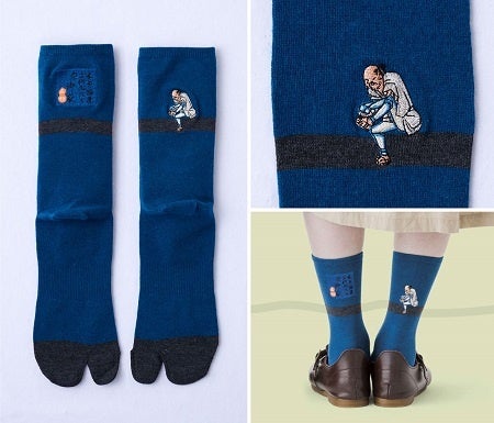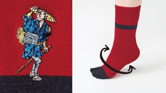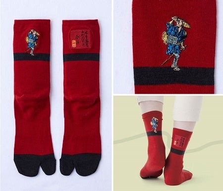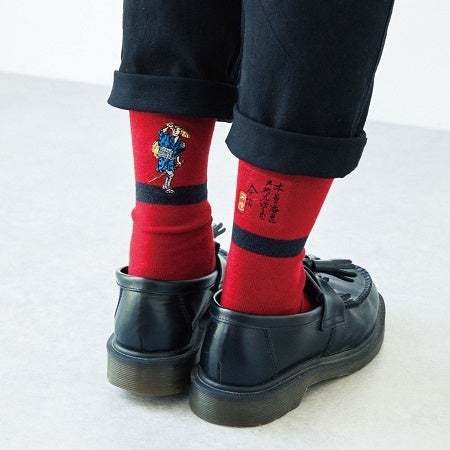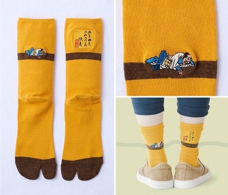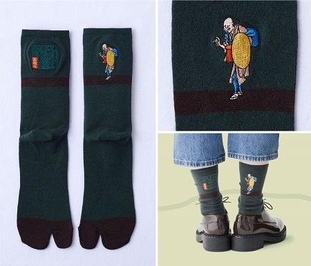 歌川広重の「木曽海道六拾九次之内」に登場するタビ(旅)するおじさんをモチーフにしたタビ(足袋)形の靴下です。コーディネートのアクセントになるようなカラーの靴下をベースに、作品から抽出した文字とおじさんの刺しゅうが左右それぞれに施されています。はくたびにおじさんと一緒にお出かけしているような楽しい気分を味わえます。