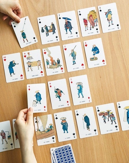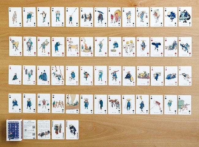 歌川広重が描いた名所絵・東海道作品たちの中に登場する、素敵なおじさんたちを絵柄にしたトランプです。遊びながら広重の描くおじさんを愛で、東海道の宿場も知ることができます。順番にカードをテーブルの上に並べていく「7ならべ」ならぬ「おじならべ」が最も本領を発揮します。