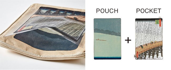 作品の絵柄を手前と奥で分けてレイヤー化し、外ポケットとポーチ本体に分けてプリントしています。重ねることで、広重の名作の構図を意識して味わうことができます。