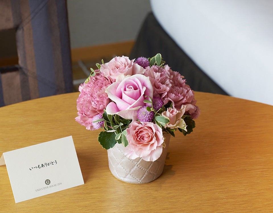 5月7日(水)~6月30日(水)の期間、「エグゼクティブハウス 禅」のエグゼクティブデラックス以上のお部屋にご宿泊いただいた各日5組さま限定で、フラワーアレンジメントをプレゼント。持ち運びしやすいサイズ感で、お家に帰ってもホテルステイの余韻に浸る時間をお贈りいただけます。親子水入らずの旅行に、またご両親へのプレゼントに、ぜひ“ありがとう”のこもったギフトをご活用ください。
