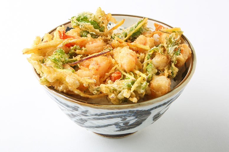 海老、貝柱、イカだけを贅沢に使ったサクサクの海鮮かき揚げを炊き立てご飯にのせた、看板メニュー。