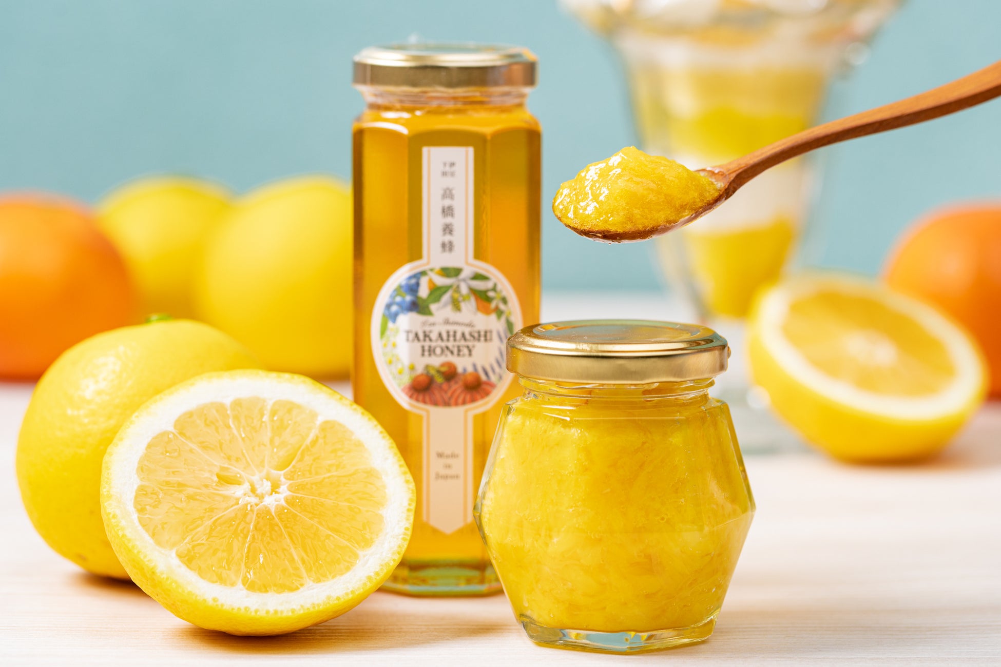 また、地元食材や地域の商品を知っていただきたいとのパティシエの思いから、本パフェにも多く取り入れています。伊豆産甘夏と下田市・高橋養蜂のはちみつを使用したジャムや、伊豆の農協で作られているニューサマーオレンジのジュースを使用したゼリー、藤枝産緑茶を使ったラングドシャやシナモンクッキー、伊豆産牛乳を使用したカスタードクリームなどのスイーツを重ねました。
