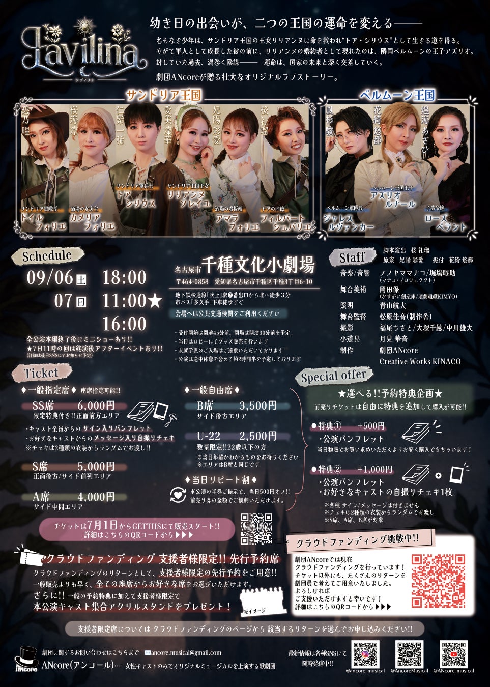 劇団ANcore 第3回公演ミュージカル『Lavilina -ラヴィリナ-』が2025年9月6日 (土) 〜 2025年9月7日 (日)に千種文化小劇場(愛知県名古屋市千種区千種3丁目6番10号)にて上演されます。