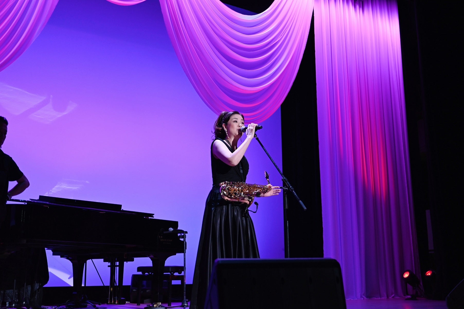 全16曲を歌唱。「京都…発」「京都ふたたび」「京都別れ雨」「八坂恋物語」など京都を題材にしたオリジナル曲を中心に進行し、「コーヒールンバ」「ウナ・セラ・ディ東京」といった名曲カバーを得意のサックス演奏とともに歌い上げて会場を盛り上げた。ステージの最後には、「わたしの一番新しい曲を初めて聴いていただきます。