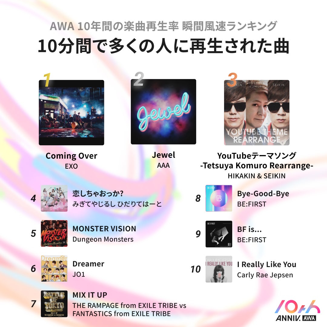 「10分間風速ランキング」では、2016年にAWAで独占先行配信されたEXOの『Comming Over』やAAAの『Jewel』、2017年にAWA × HIKAKIN & SEIKIN × 小室哲哉で実現した『YouTubeテーマソング -Tetsuya Komuro Rearrange-』が、公開と同時に多くの人に再生され、TOP3にランクイン。
