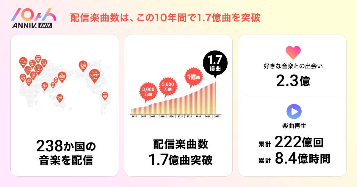 AWA株式会社(本社:東京都港区、代表取締役CEO:冨樫晃己)が運営する、サブスクリプション型(定額制)音楽ストリーミングサービス「AWA(アワ)」は、2025年5月27日(火)にサービス開始10周年を迎えました。これを記念し、この10年間、音楽とともに歩んでくれたすべての人へ感謝を込めた特設サイトを公開しました。10年間のデータをもとにしたインフォグラフィックスのほか、アーティストやユーザーから募った「人生のエンパワーメントソング」、有料プランが実質10円で使えるおトクなキャンペーンなどをまとめております。