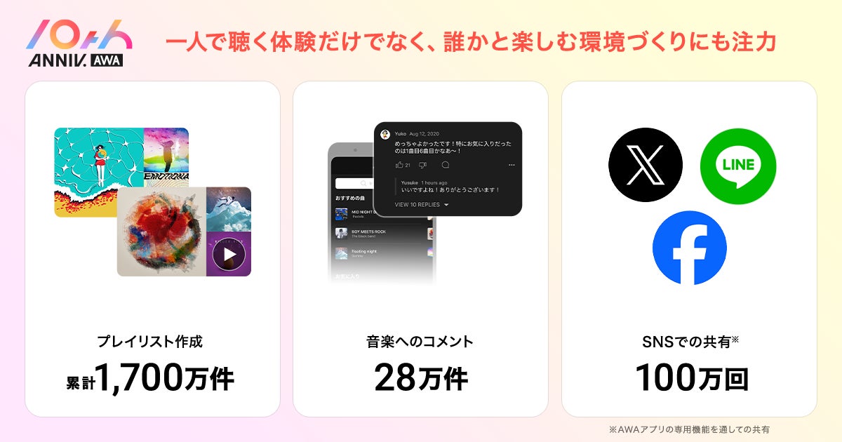 多種多様な感性にマッチした音楽と出会いやすくするために、メディア作成のプレイリストを主体としたサービスが多い中、ユーザープレイリストを主体とした、リスナー同士でキュレーションし合う「プレイリスター文化」を醸成し、1,700万件ものプレイリストが作成されています。また、アーティスト、アルバム、楽曲、プレイリスト一つひとつに対して、その魅力や自分の想いを自由に書き込める「コメント」は28万件におよび、「誰かの一言が、誰かの出会いになる」循環は、AWAならではの文化として根付きつつあります。