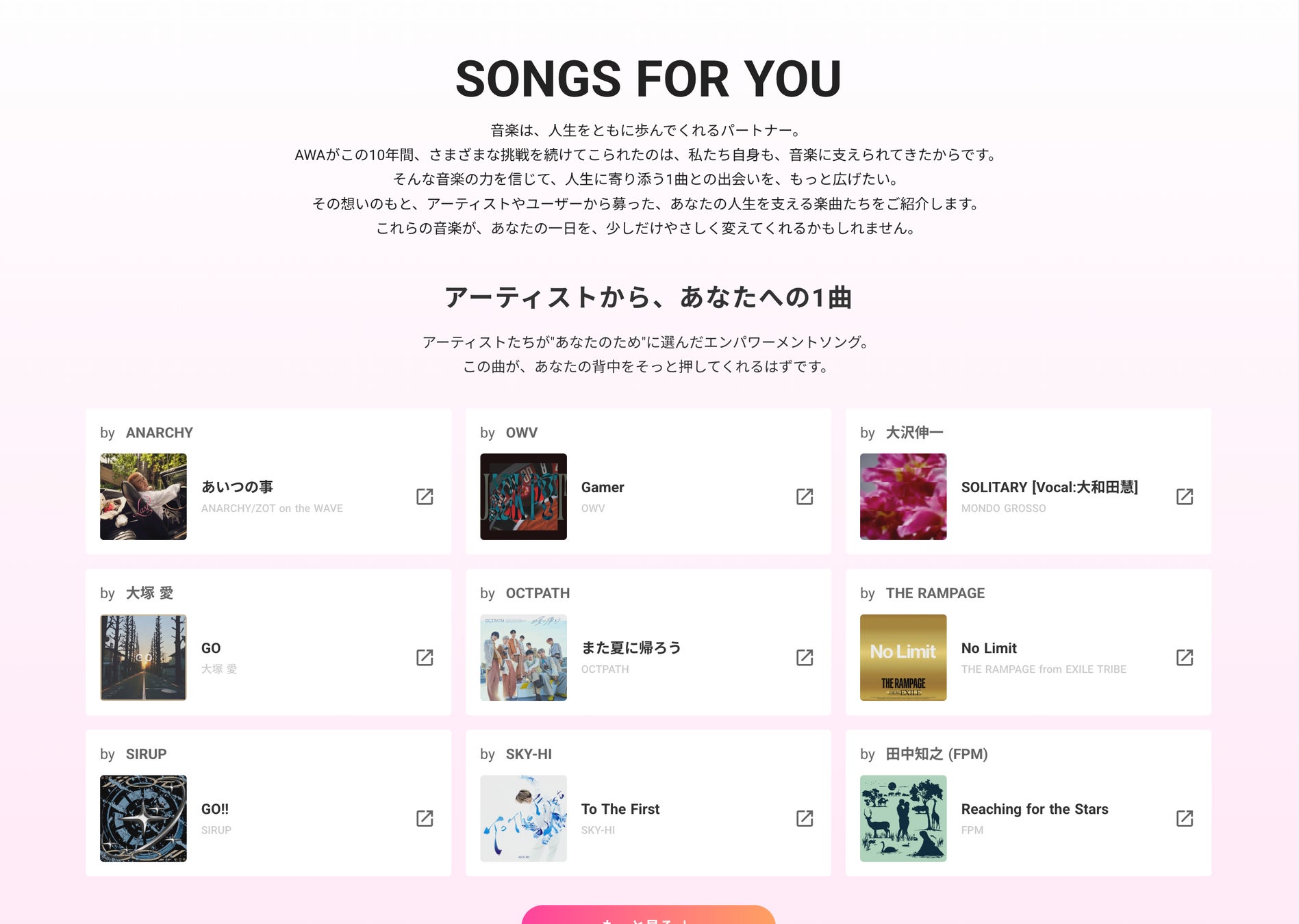 AWAがこの10年間、さまざまな挑戦を続けてこられたのは、私たち自身もまた、音楽の力に何度も支えられてきたからです。そんな音楽の力を信じて、人生に寄り添う1曲との出会いを、もっと広げたい。その想いのもと、本特設サイトでは、アーティストやユーザーから募った人生に寄り添ってくれる音楽をご紹介しています。