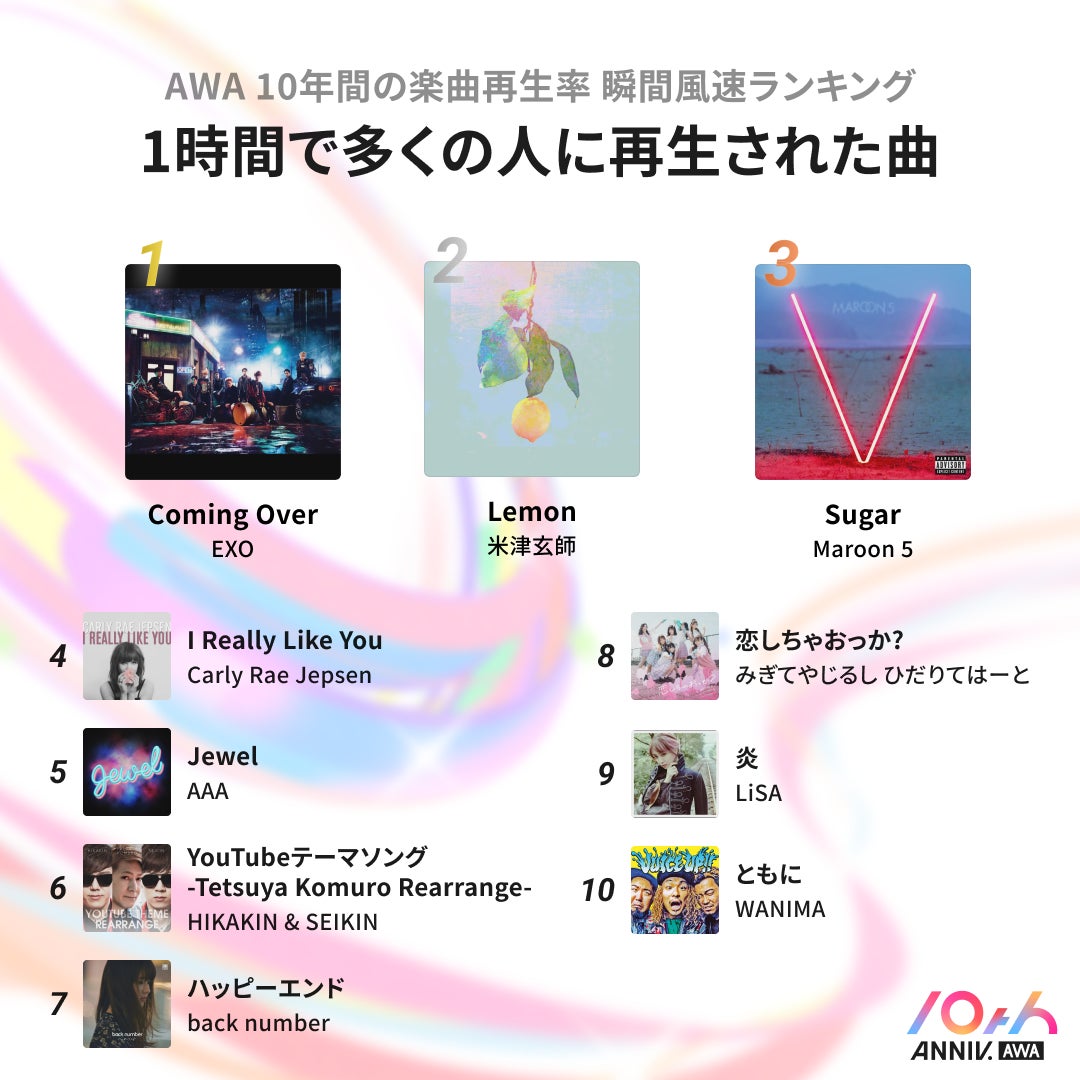 「1時間風速ランキング」では、2020年8月5日に全作品解禁と同時にAWAの急上昇ランキング「THE HOT 100」の上位76位までを独占した米津玄師の代表曲「Lemon」や、2015年のAWAローンチ直後、世界中の楽曲が手軽に聴けるようになったことで、Maroon 5の『Sugar』、Carly Rae Jepsenの『I Really Like You』といったグローバルでも人気の洋楽曲が多くの人に再生され、上位にランクインしました。