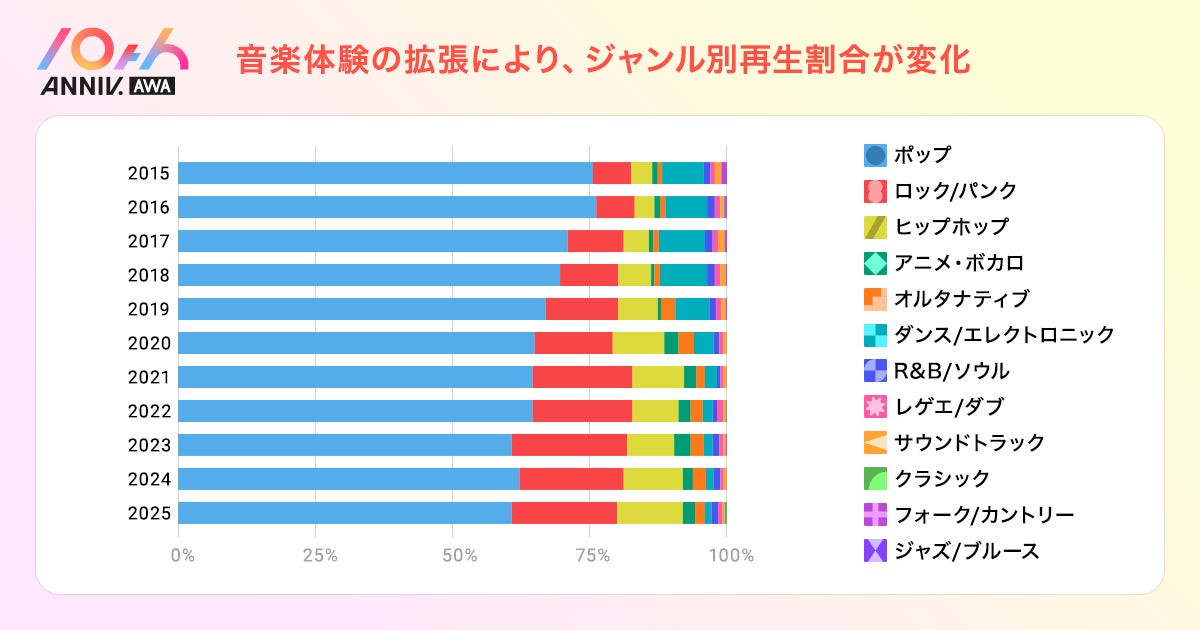 これらの音楽体験の拡張により、ユーザーの好きな音楽との出会いが広がり、従来から人気のあるポップスだけでなく、ロックやヒップホップをはじめとした様々なジャンルがより自由に楽しまれるようになりました。