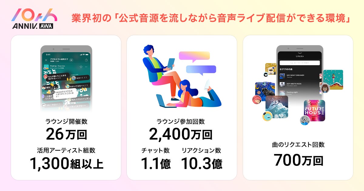 ユーザー同士が同じ空間で同じ音楽を楽しめる「AWAラウンジ」では、これまでに26万回の開催、2,400万回の参加があり、音楽体験の新しい形として定着してきました。ラウンジ内では、700万回の楽曲リクエストが飛び交い、1.1億回のチャットと10.3億回のリアクションが生まれるなど、楽曲をただ“聴く”だけでなく、“感じ合い、語り合う”、そんな音楽コミュニケーションの場として広がっています。