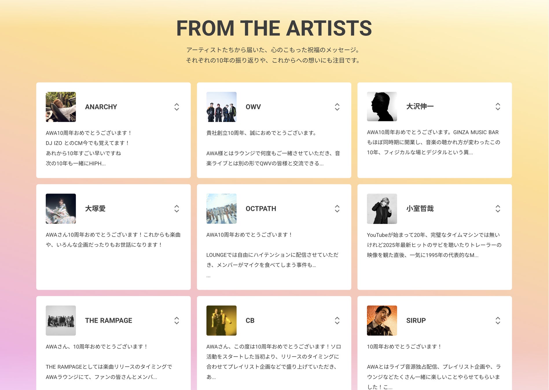 特設サイトでは、AWAのサービス開始10周年を記念して、これまでに様々なお取り組みをしたアーティストから届いた祝福のメッセージも公開しています。アーティストの皆様の10年間の振り返りや今後にかける想いも入った素敵なメッセージをぜひご覧ください。